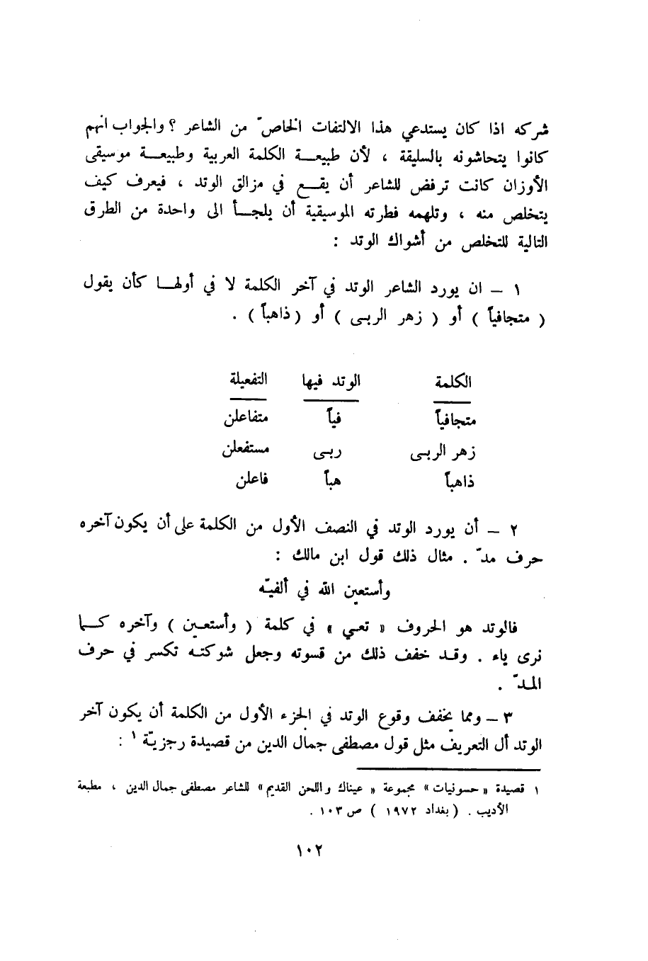 شركه إذا كان يستدعي هذا الالتفات الخاص من الشاعر؟ والجواب أنهم كانوا يتحاشونه بالسليقة؛ لأن طبيعة الكلمة العربية وطبيعة موسيقى الأوزان كانت ترفض للشاعر أن يقع في مزالق الوتد، فيعرف كيف يتخلص منه، وتلهمه فطرته الموسيقية أن يلجأ إلى واحدة من الطرق التالية للتخلص من أشواك الوتد:
