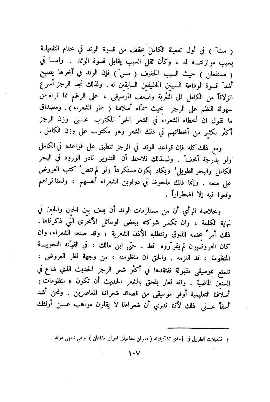 وخلاصة الرأي أن من مستلزمات الوتد أن يقف بين الحين والحين في نهاية الكلمة، وأن تكسر شوكته ببعض الوسائل الأخرى التي ذكرناها. ذلك أمر يحتمه الذوق وتتطلبه الأذن الشعرية، وقد صنعه الشعراء، وإن كان العروضيون لم يقرروه قط. حتى ابن مالك، في ألفيته النحوية المنظومة، قد التزمه. والحق أن منظومته، من وجهة نظر العروض، تتمتع بموسيقى مقبولة نفتقدها في أكثر شعر الرجز الحديث الذي شاع في السنين الماضية. وإنه لعار يحلق بالشعر الحديث أن تكون "منظومات" أسلافنا التعليمية أوفر موسيقى من قصائد شعرائنا المعاصرين. ونحن أشد أسفًا على ذلك لأننا ندري أن شعراءنا لا يقلون مواهب عن أولئك
