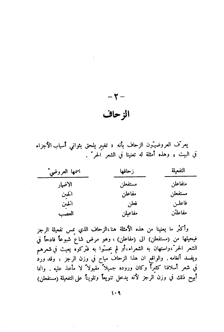 وأكثر ما يعنينا من هذه الأمثلة هنا، الزحاف الذي يمس تفعيلة الرجز فيحيلها من "مستفعلن" إلى "مفاعلن"، وهو مرض شاع شيوعًا فادحًا في الشعر الحر، واستهان به الشعراء، أو لم يحسوا به فتركوه يعيث في شعرهم ويفسد أنغامه. والواقع أن هذا الزحاف مباح في وزن الرجز، وقد ورد في شعر أسلافنا كثيرًا وكان وروده جميلًا مقبولًا لا مأخذ عليه. وإنما أبيح ذلك في وزن الرجز لأنه يدخل تنويعًا وتلوينًا على التفعيلة "مستفعلن".