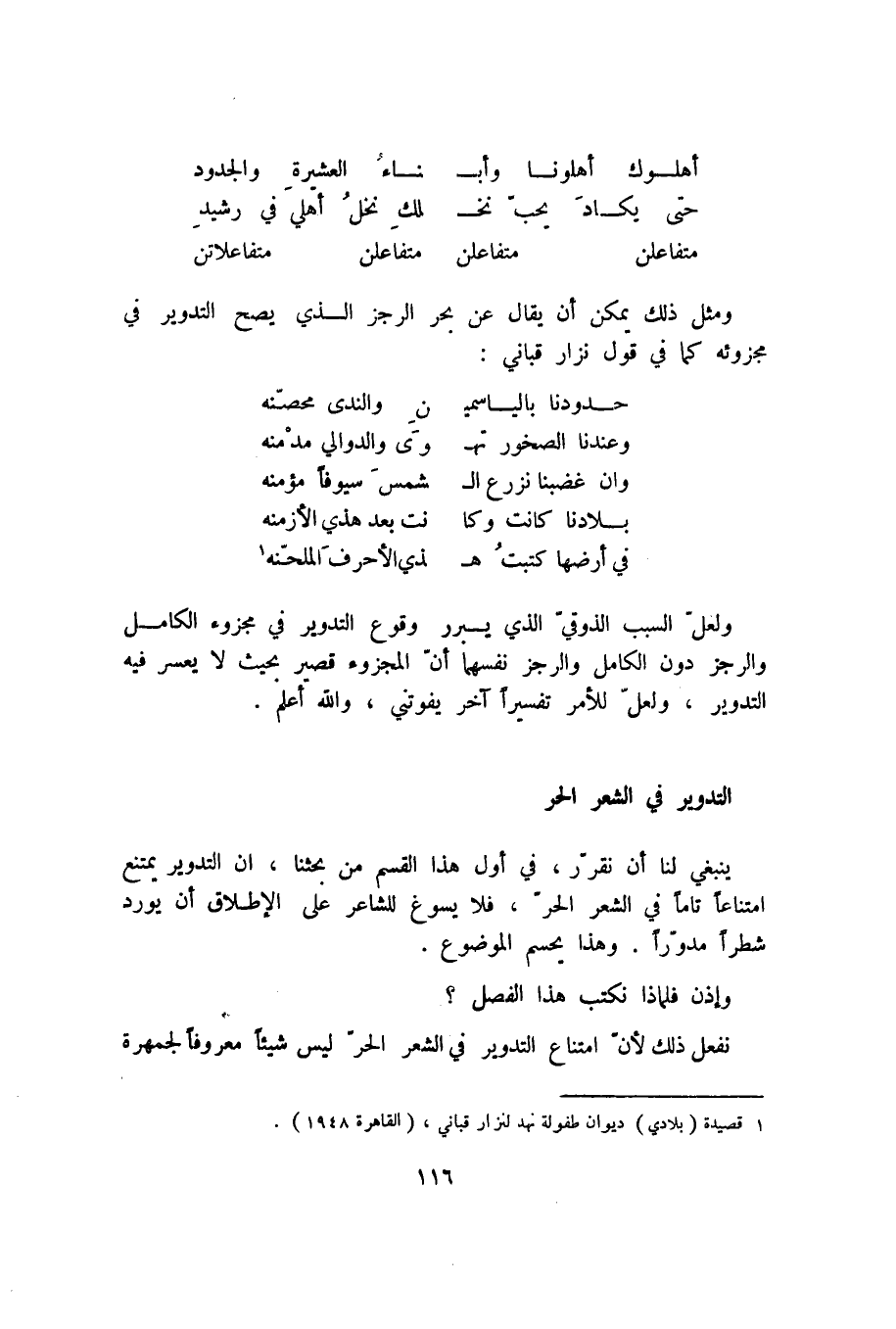 ومثل ذلك يمكن أن يقال عن بحر الرجز الذي يصح التدوير في مجزوئه كما في قول نزار قباني: