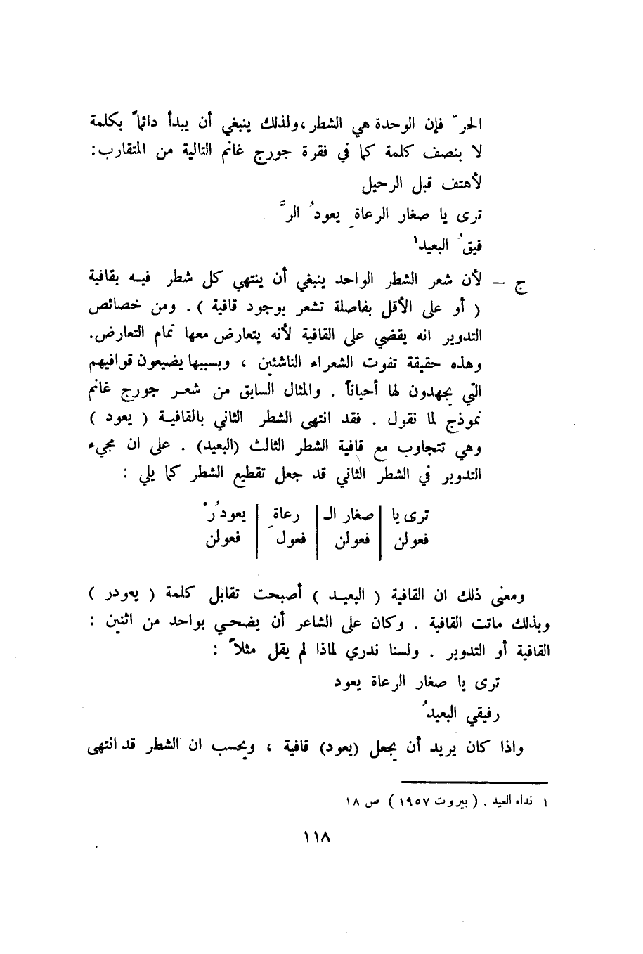 ج- لأن شعر الشطر الواحد ينبغي أن ينتهي كل شطر فيه بقافية "أو على الأقل بفاصلة تشعر بوجود قافية". ومن خصائص التدوير أنه يقضي على القافية لأنه يتعارض معها تمام التعارض. وهذه حقيقة تفوت الشعراء الناشئين. وبسببها يضيعون قوافيهم التي يجهدون لها أحيانًا. والمثال السابق من شعر جورج غانم نموذج لما نقول. فقد انتهى الشطر الثاني بالقافية "يعود" وهي تتجاوب مع قافية الشطر الثالث "البعيد". على أن مجيء التدوير في الشطر الثاني قد جعل تقطيع الشطر كما يلي: