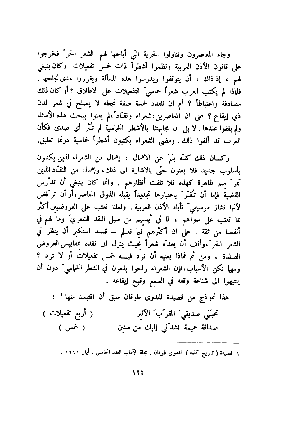 وكان ذلك كله ينم عن الإهمال، إهمال من الشعراء الذين يكتبون بأسلوب جديد فلا يعنون حتى بالإشارة إلى ذلك، وإهمال من النقاد الذين تمر بهم ظاهرة كهذه فلا تلفت أنظارهم. وإنما كان ينبغي أن تدرس القضية فإما أن تُقر باعتبارها تجديدًا يقبله الذوق المعاصر، أو أن ترفض لأنها نشاز موسيقي تأباه الأذن العربية. ولعلنا نعتب على العروضيين أكثر مما نعتب على سواهم، لما في أيديهم من سبل النقد الشعري وما لهم في أنفسنا من ثقة. على أن أكثرهم فيما نعلم قد استكبر أن ينظر في الشعر الحر، وأنف أن يعده شعرًا بحيث ينزل إلى نقده بمقاييس العروض الصلدة، ومن ثم فماذا يعنيه أن ترد فيه خمس تفعيلات أو لا ترد؟ ومهما تكن الأسباب، فإن الشعراء راحوا يقعون في الشطر الخماسي دون أن ينتبهوا إلى شناعة وقعه في السمع وقبح إيقاعه.