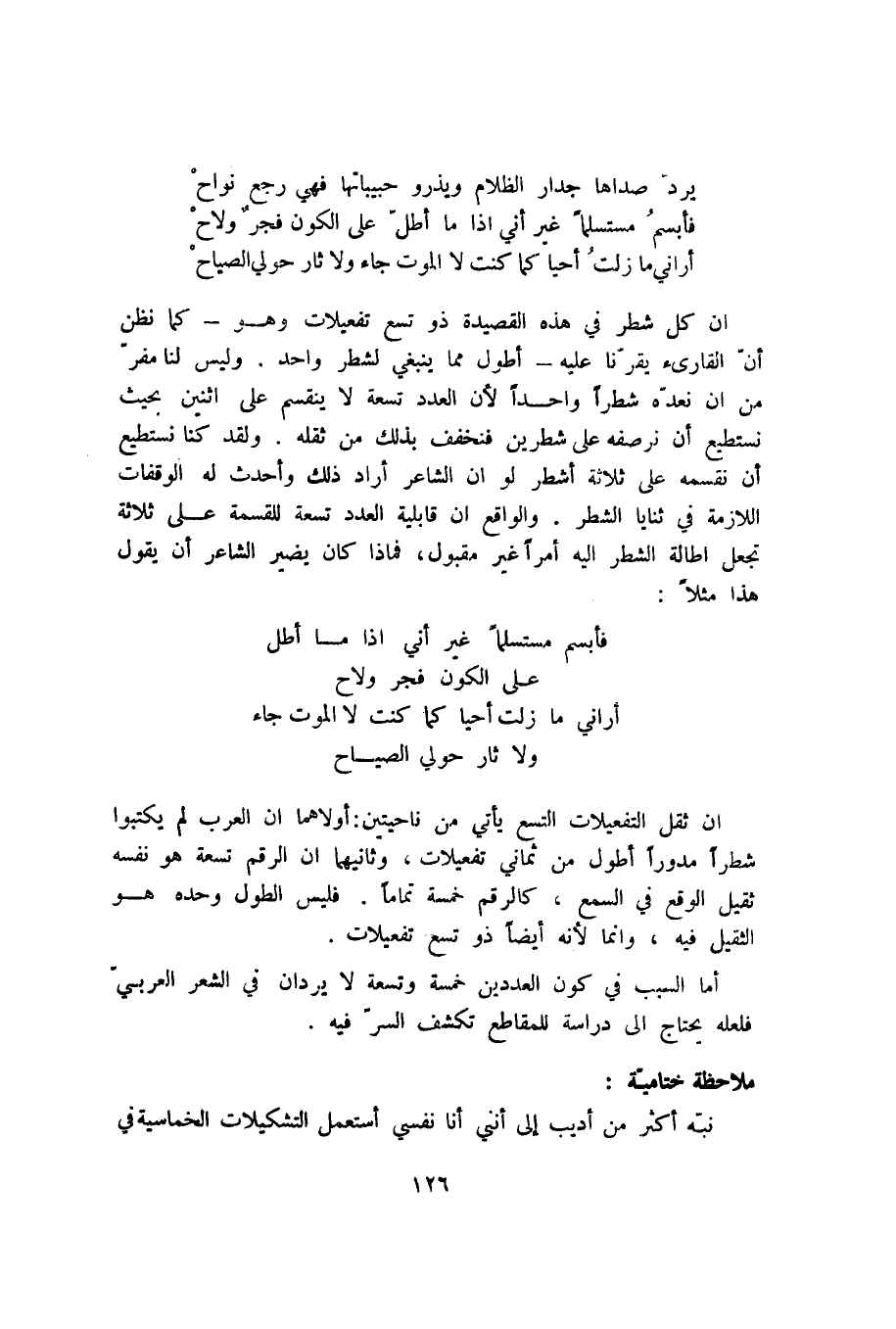 أما السبب في كون العددين خمسة وتسعة لا يردان في الشعر العربي فلعله يحتاج إلى دراسة للمقاطع تكشف السر فيه.