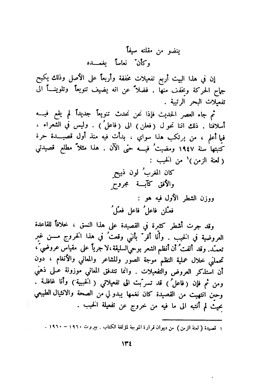 ثم جاء العصر الحديث فإذا نحن نحدث تنويعًا جديدًا لم يقع فيه أسلافنا. ذلك أننا نحول "فعلن" إلى "فاعل". وليس في الشعراء، فيما أعلم، من يرتكب هذا سواي، بدأت فيه منذ أول قصيدة حرة كتبتها سنة 1947 ومضيت فيه حتى الآن. هذا مثلًا مطلع قصيدتي "لعنة الزمن"1 من الخبب: