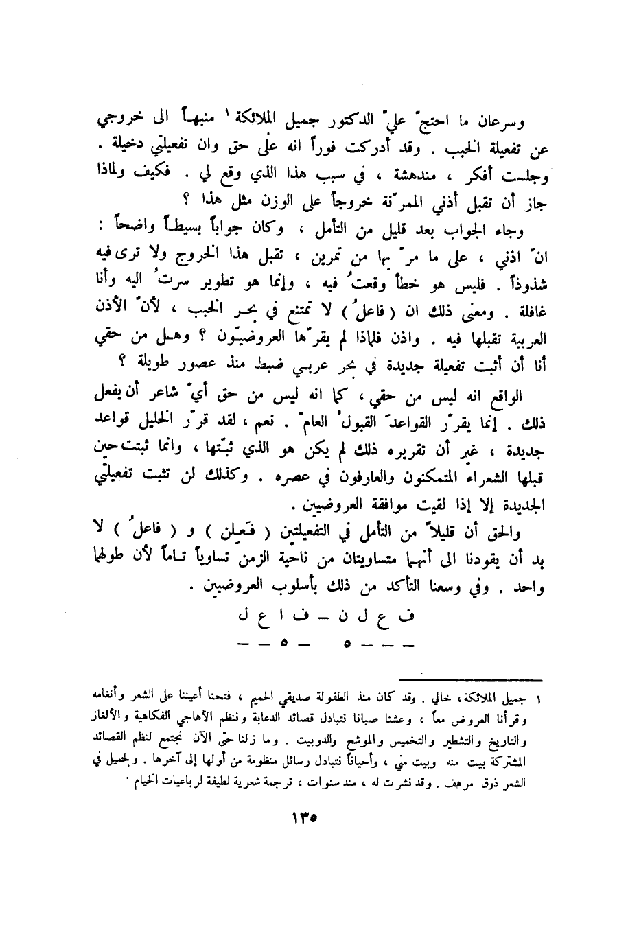 وسرعان ما احتج علي الدكتور جميل الملائكة1 منبهًا إلى خروجي عن تفعيلة الخبب. وقد أدركت فورًا أنه على حق وأن تفعيلتي دخيلة. وجلست أفكر، مندهشة، في سبب هذا الذي وقع لي. فكيف ولماذا جاز أن تقبل أذني الممرنة خروجًا على الوزن مثل هذا؟