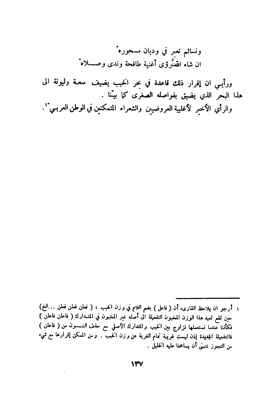 ورأيي أن إقرار ذلك قاعدة في بحر الخبب يضيف سعة وليونة إلى هذا البحر يضيق بفواصله الصغرى كما بيَّنا