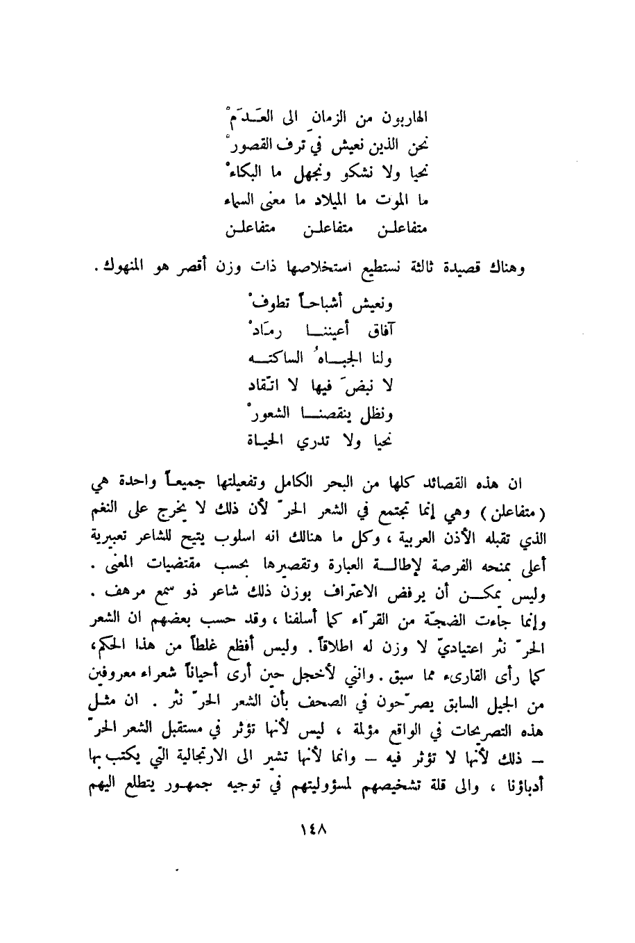 إن هذه القصائد كلها من البحر الكامل وتفعيلتها جميعًا واحدة هي "متفاعلن" وهي إنما تجتمع في الشعر الحر لأن ذلك لا يخرج على النغم الذي تقبله الأذن العربية، وكل ما هنالك أنه أسلوب يتيح للشاعر تعبيرية أعلى يمنحه الفرصة لإطالة العبارة وتقصيرها بحسب مقتضيات المعنى. وليس يمكن أن يرفض الاعتراف بوزن ذلك شاعر ذو سمع مرهف. وإنما جاءت الضجة من القراء كما أسلفنا، وقد حسب بعضهم أن الشعر الحر نثر اعتيادي لا وزن له إطلاقًا. وليس أفظع غلطًا من هذا الحكم، كما رأى القارئ مما سبق. وإنني لأخجل حين أرى أحيانًا شعراء معروفين من الجيل السابق يصرحون في الصحف بأن الشعر الحر نثر. إن مثل هذه التصريحات الواقعة مؤلمة، ليس لأنها تؤثر في مستقبل الشعر الحر -ذلك لأنها لا تؤثر فيه- وإنما لأنها تشير إلى الارتجالية التي يكتب بها أدباؤنا، وإلى قلة تشخيصهم لمسئوليتهم في توجيه جمهور يتطلع إليهم