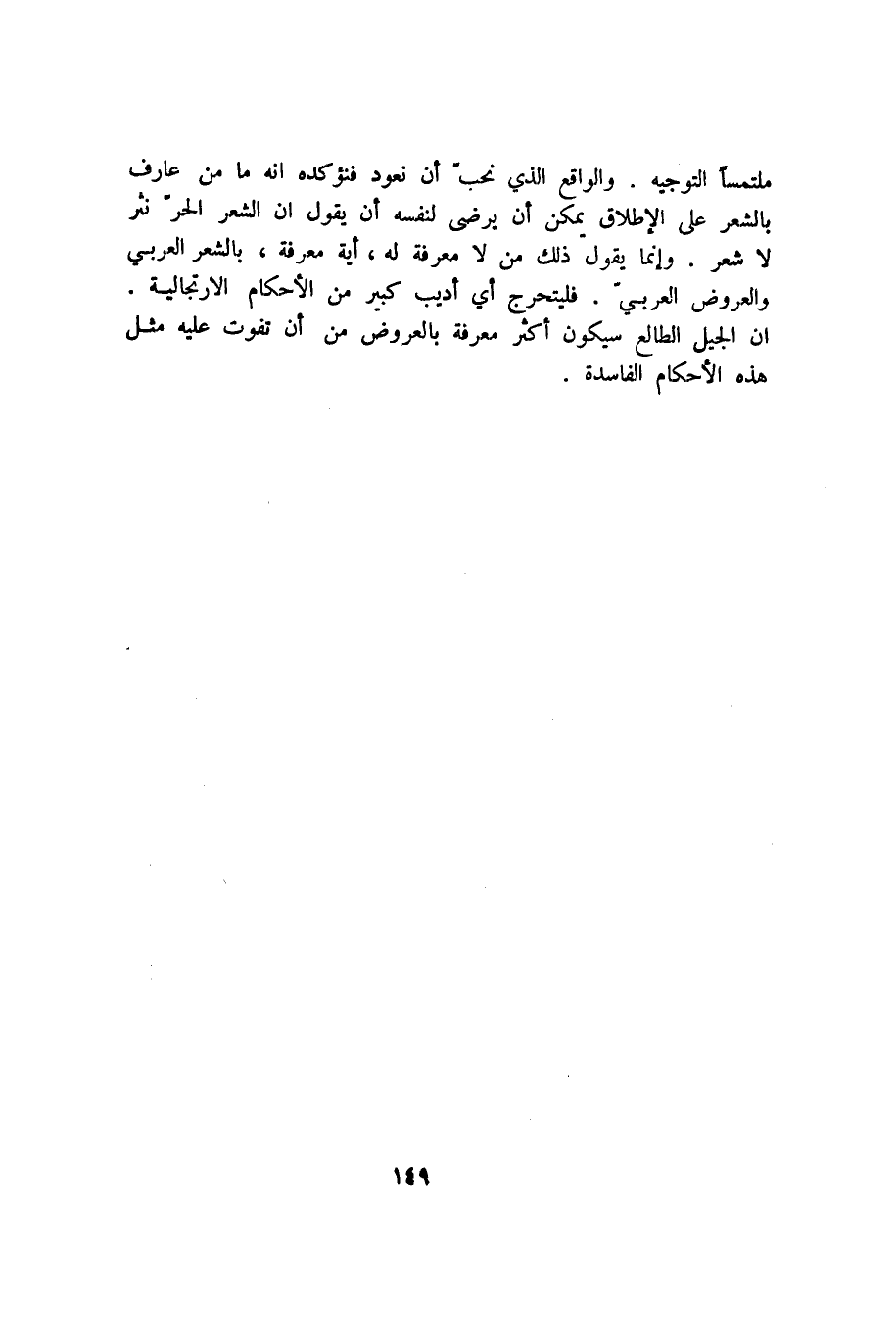 ملتمسًا التوجيه. والواقع الذي نحب أن نعود فنؤكده أنه ما من عارف بالشعر على الإطلاق يمكن أن يرضى لنفسه أن يقول إن الشعر الحر نثر لا شعر. وإنما يقول ذلك من لا معرفة له، أية معرفة، بالشعر العربي والعروض العربي. فليتحرج أي أديب كبير من الأحكام الارتجالية. إن الجيل الطالع سيكون أكثر معرفة بالعروض من أن تفوت عليه مثل هذه الأحكام الفاسدة.