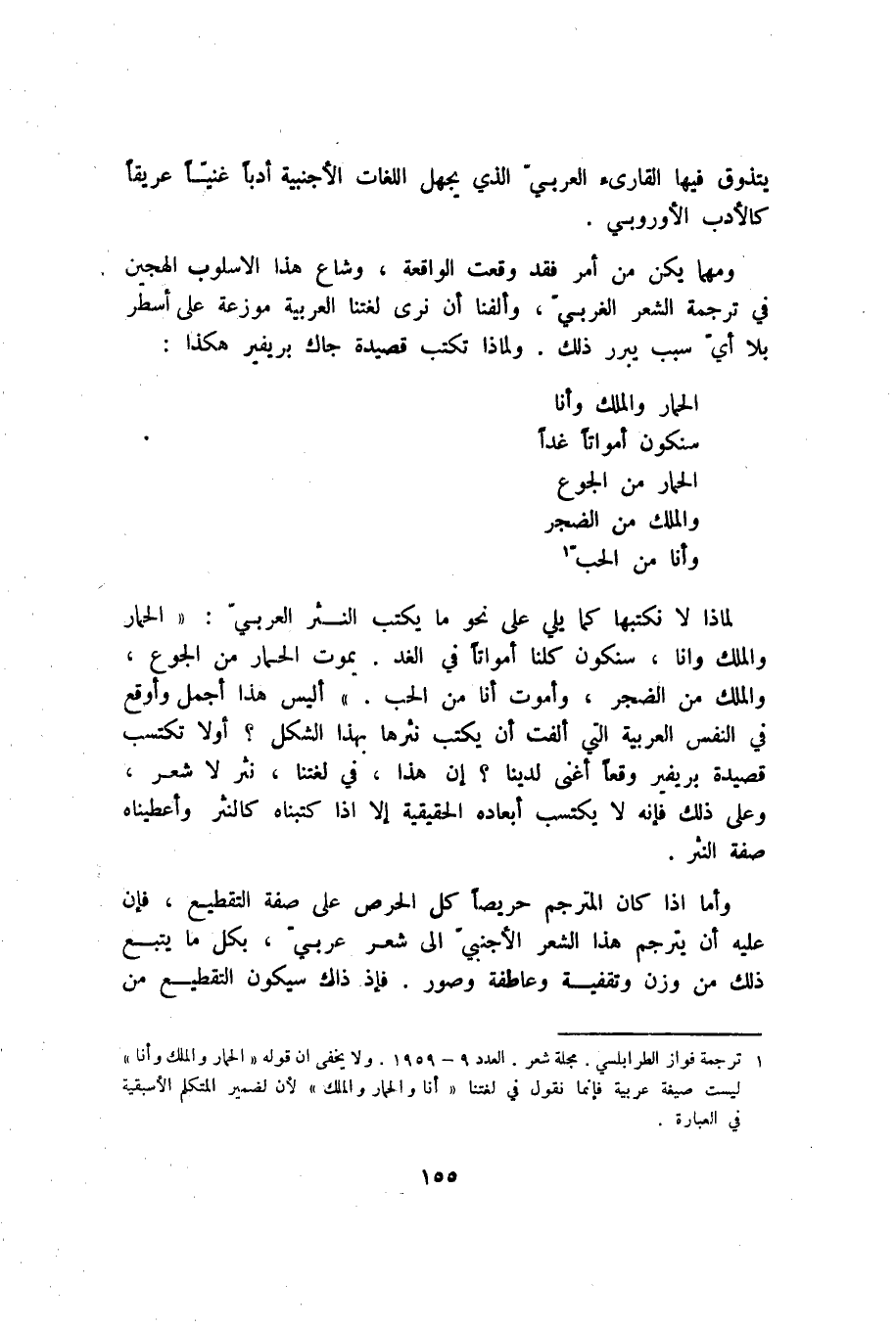 لماذا لا نكتبها كما يلي على نحو ما يكتب النثر العربي: "الحمار والملك وأنا، سنكون كلنا أمواتًا في الغد. يمو ت الحمار من الجوع، والملك من الضجر، وأموت أنا من الحب" أليس هذا أجمل وأوقع في النفس العربية التي ألفت أن يكتب نثرها بهذا الشكل؟ أولًا تكتسب قصيدة بريفير وقعًا أغنى لدينا؟ إن هذا، في لغتنا، نثر لا شعر، وعلى ذلك فإنه لا يكتسب أبعاده الحقيقية إلا إذا كتبناه كالنثر وأعطيناه صفة النثر.