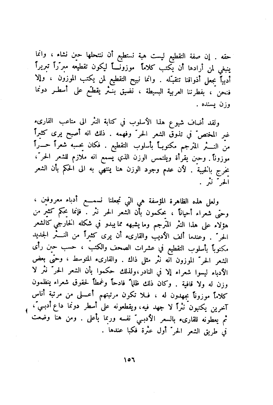 حقه. إن صفة التقطيع ليست هبة نستطيع أن ننتحلها حين نشاء، وإنما ينبغي لمن أرادها أن يكتب كلامًا موزونًا ليكون تقطيعه مبررًا تبريرًا أدبيًّا يجعل أذواقنا تتقبله. وإنما نبيح التقطيع لمن يكتب الموزون، وإلا فنحن، بفطرتنا العربية البسيطة، نضيق بنثر يقطع على أسطر دونما وزن يسنده.