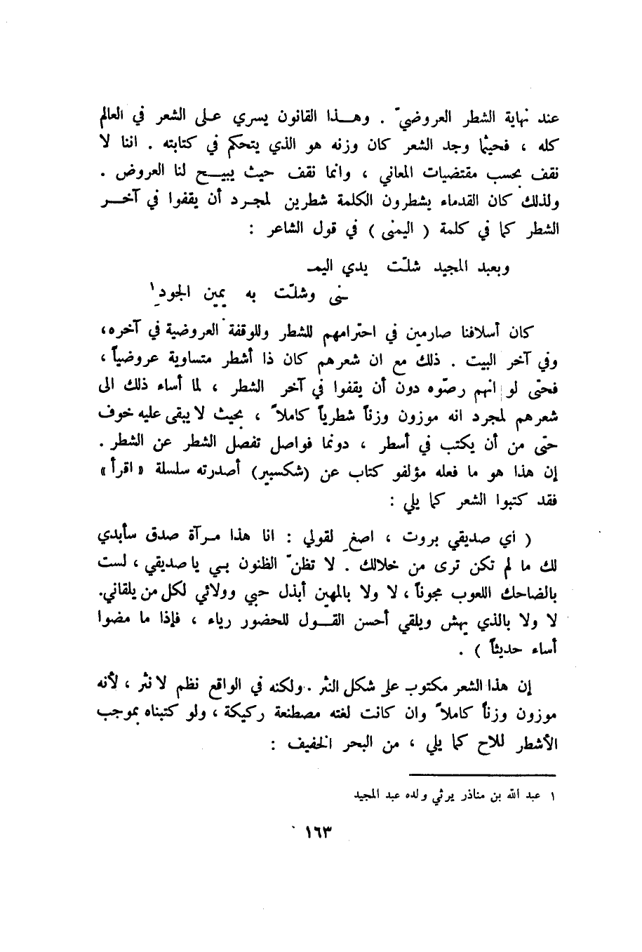 كان أسلافنا صارمين في احترامهم للشطر وللوقف العروضية في آخره، وفي آخر البيت. ذلك مع أن شعرهم كان ذا أشطر متساوية عروضيًّا، فحتى لو أنهم رصوه دون أن يقفوا في آخر الشطر، لما أساء ذلك إلى شعرهم لمجرد أنه موزون وزنًا شطريًّا كاملًا، بحيث لا يبقى عليه خوف حتى من أن يكتب في أسطر، دونما فواصل تفصل الشطر عن الشطر. إن هذا هو ما فعله مؤلفو كتاب عن "شكسبير" أصدرته سلسلة "اقرأ" فقد كتبوا الشعر كما يلي: