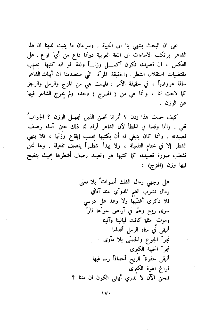 على أن البحث ينتهي بنا إلى الخيبة. وسرعان ما يثبت لدينا أن هذا الشاعر يرتكب الإساءات إلى اللغة العربية دونما داعٍ من أي نوع. على العكس، إن قصيدته تكون أكمل وزنًا ولغة لو أنه كتبها بحسب مقتضيات استقلال الشطر. والحقيقة المرة التي ستصدمنا أن أبيات الشاعر سالمة عروضيًّا، في حقيقة الأمر، فليست هي من الهزج والرمل والرجز كما لاحت لنا، وإنما هي من "الهزج" وحده ولم يخرج الشاعر فيها عن الوزن.