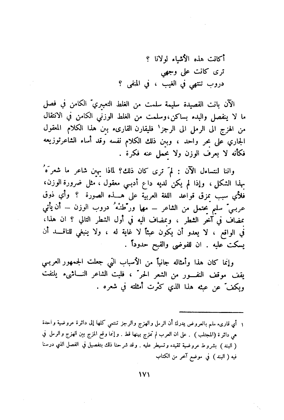 وإننا لنتساءل الآن: لم ترى كان ذلك؟ لماذا يهين شاعر ما شعره بهذا الشكل، وإذا لم يكن لديه داعٍ أدبي معقول، مثل ضرورة الوزن، فلأي سبب يمزق قواعد اللغة العربية على هذه الصورة؟ وأي ذوق عربي سليم يحتمل من الشاعر -مهما ورطته دروب الوزن- أن يأتي بمضاف في آخر الشطر، وبمضاف إليه في أول الشطر التالي؟ إن هذا، في الواقع، لا يعدو أن يكون عبثًا لا غاية له، ولا ينبغي للناقد أن يسكت عليه. إن للفوضى والقبح حدودًا.