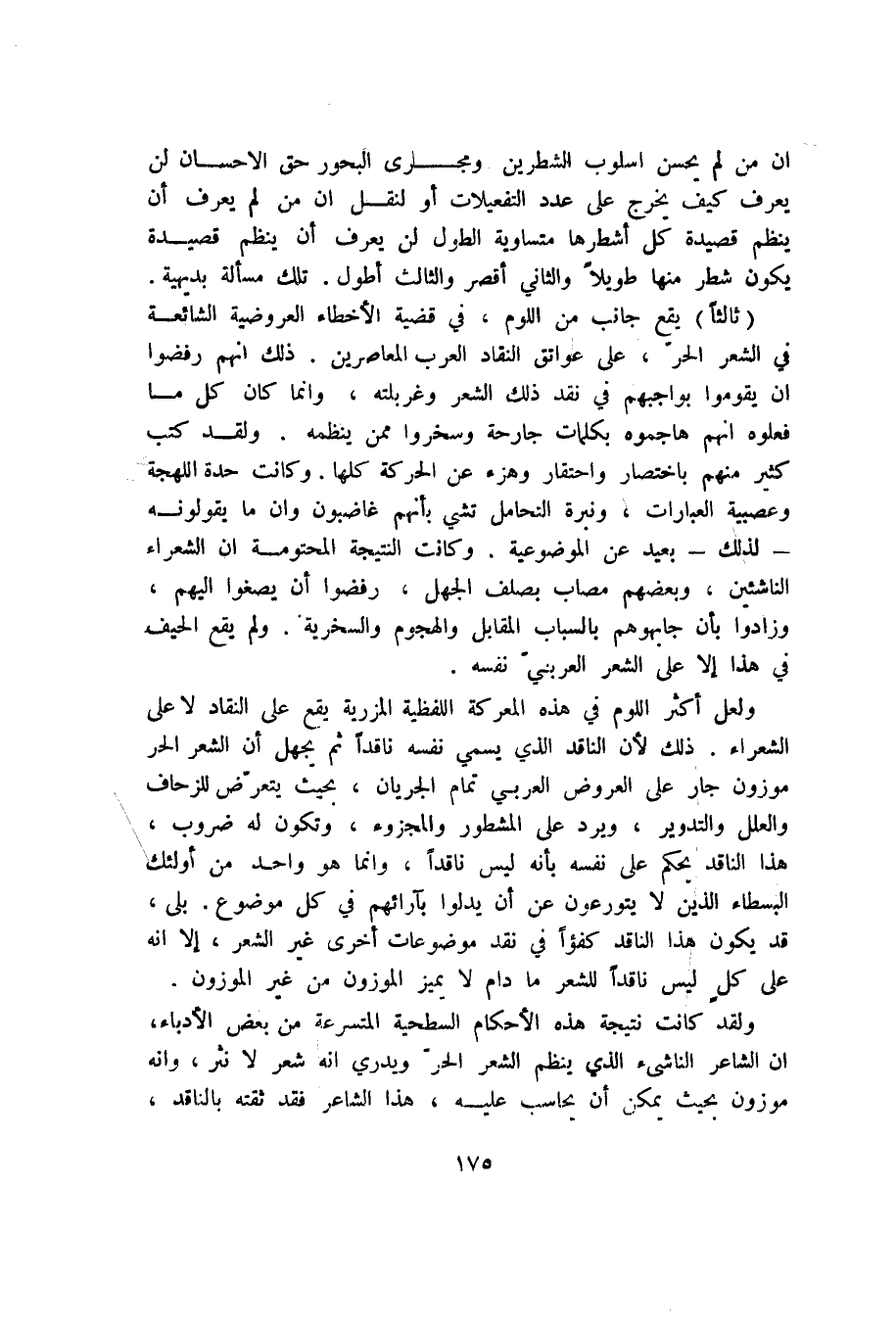 ولعل أكثر اللوم في هذه المعركة اللفظية المزرية يقع على النقاد لا على الشعراء. ذلك لأن الناقد الذي يسمي نفسه ناقدًا ثم يجهل أن الشعر الحر موزون جار على العروض العربي تمام الجريان، بحيث يتعرض للزحاف والعلل والتدوير، ويرد على المشطور والمجزوء، وتكون له ضروب، هذا الناقد يحكم على نفسه بأنه ليس ناقدًا، وإنما هو واحد من أولئك البسطاء الذين لا يتورعون عن أن يدلوا بآرائهم في كل موضوع. بلى، قد يكون هذا الناقد كفئًا في نقد موضوعات أخرى غير الشعر، إلا أنه على كلٍّ ليس ناقدًا للشعر ما دام لا يميز الموزون من غير الموزون.
