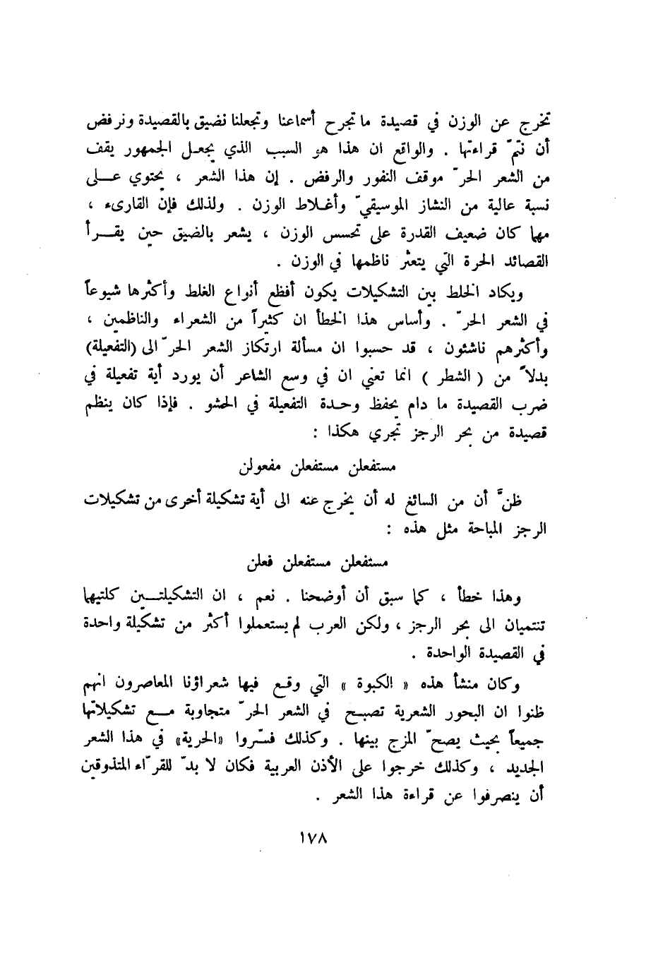 وهذا خطأ، كما سبق أن أوضحنا. نعم، إن التشكيلتين كلتيهما تنتميان إلى بحر الرجز، ولكن العرب لم يستعملوا أكثر من تشكيلة واحدة في القصيدة الواحدة.