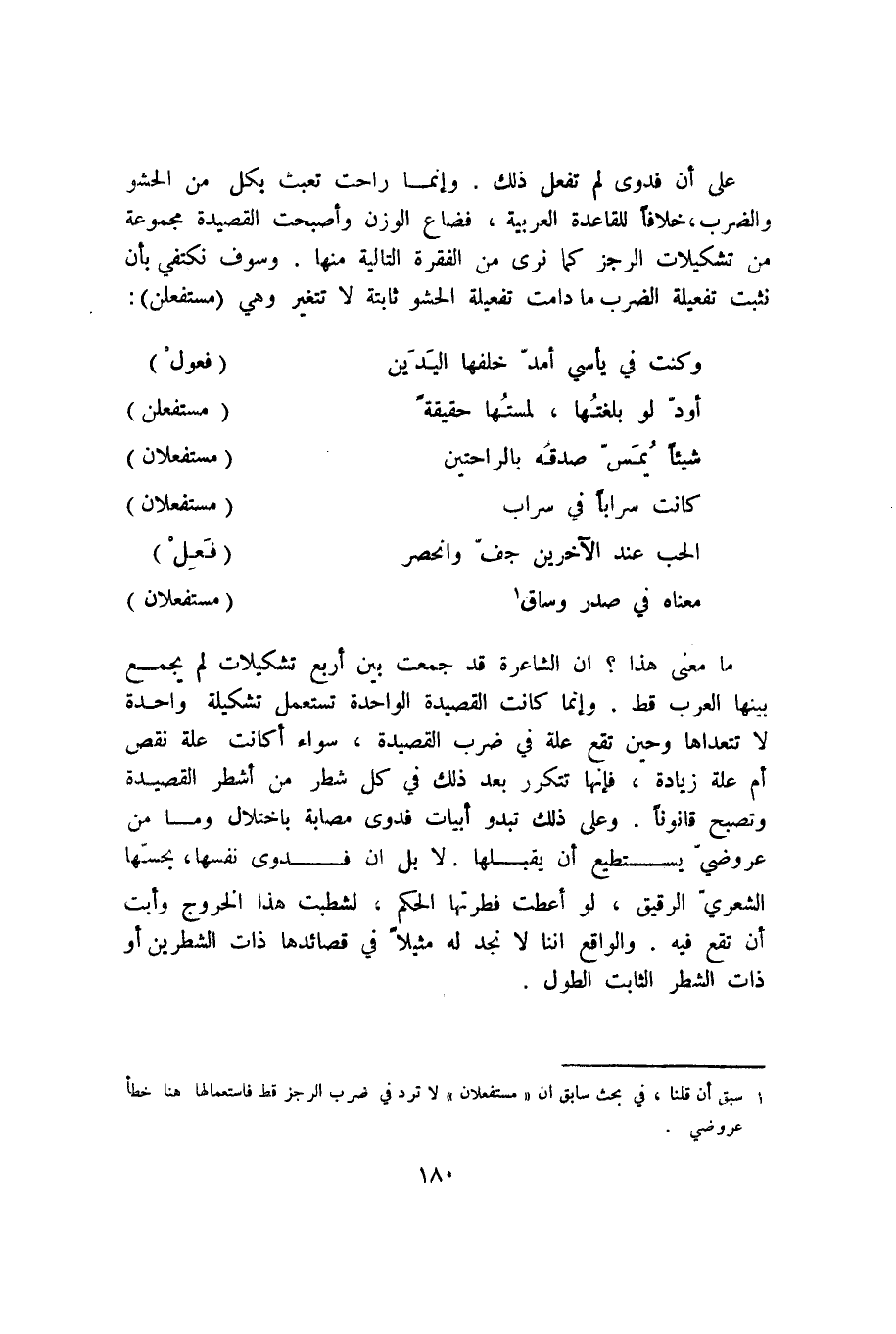 ما معنى هذا؟ أن الشاعرة قد جمعت بين أربع تشكيلات لم يجمع بينها العرب قط. وإنما كانت القصيدة الواحدة تستعمل تشكيلة واحدة لا تتعداها وحين تقع علة في ضرب القصيدة، سواء أكانت علة نقص أم علة زيادة، فإنها تتكرر بعد ذلك في كل شطر من أشطر القصيدة وتصبح قانونًا. وعلى ذلك تبدو أبيات فدوى مصابة باختلال وما من عروضي يستطيع أن يقبلها. لا بل إن فدوى نفسها، بحسها الشعري الرقيق، لو أعطت فطرتها الحكم، لشطبت هذا الخروج وأبت أن تقع فيه. والواقع أننا لا نجد له مثيلًا في قصائدها ذات الشطرين أو ذات الشطر الثابت الطول.