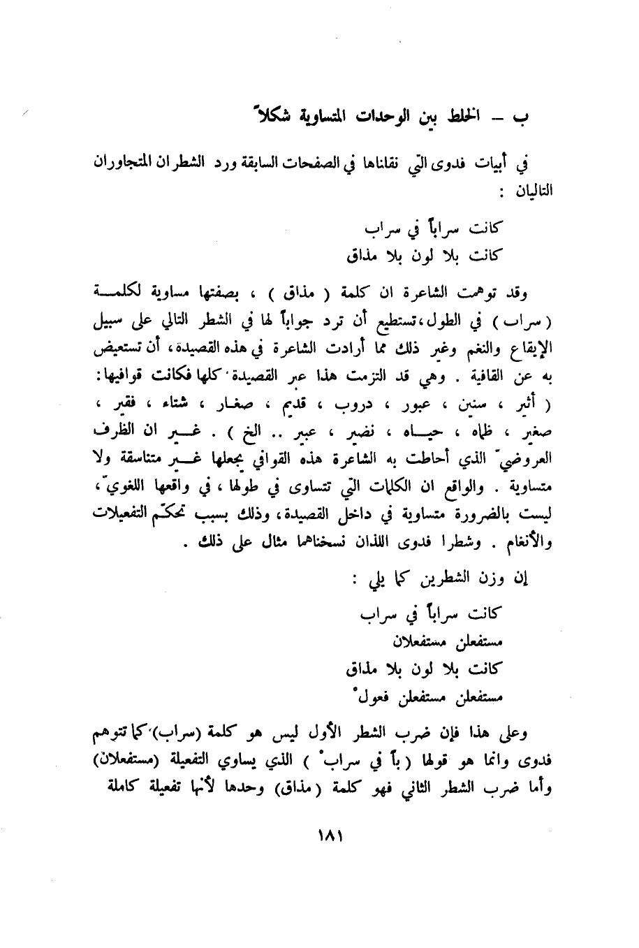 وعلى هذا فإن ضرب الشطر الأول ليس هو كلمة "سراب" كما تتوهم فدوى وإنما هو قولها "بًا في سراب" الذي يساوي التفعيلة "مستفعلان" وأما ضرب الشطر الثاني فهو كلمة "مذاق" وحدها لأنها تفعيلة كاملة