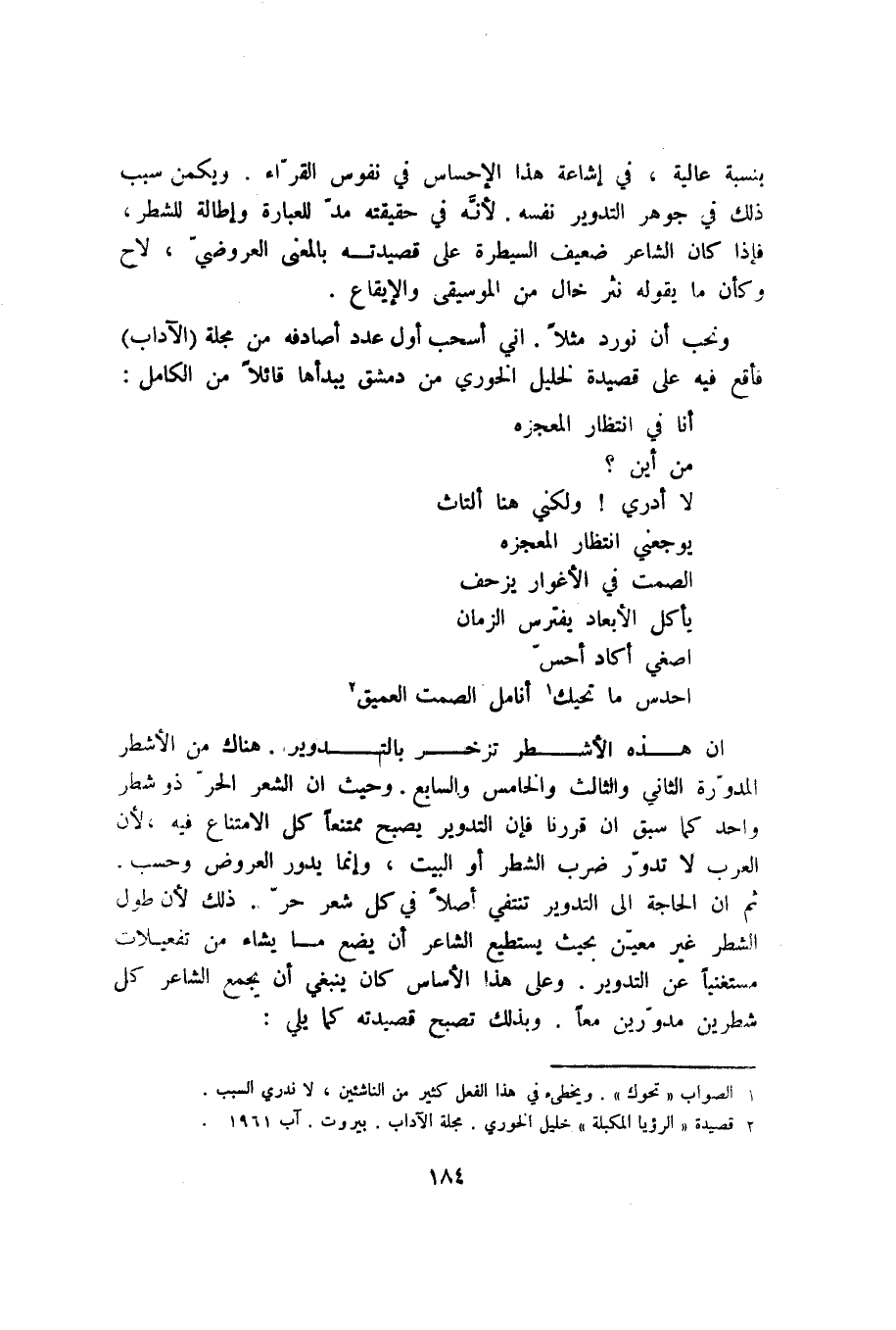 ونحب أن نورد مثلًا. إني أسحب أول عدد أصادفه من مجلة "الآداب" فأقع فيه على قصيدة لخليل الخوري من دمشق يبدؤها قائلًا من الكامل: