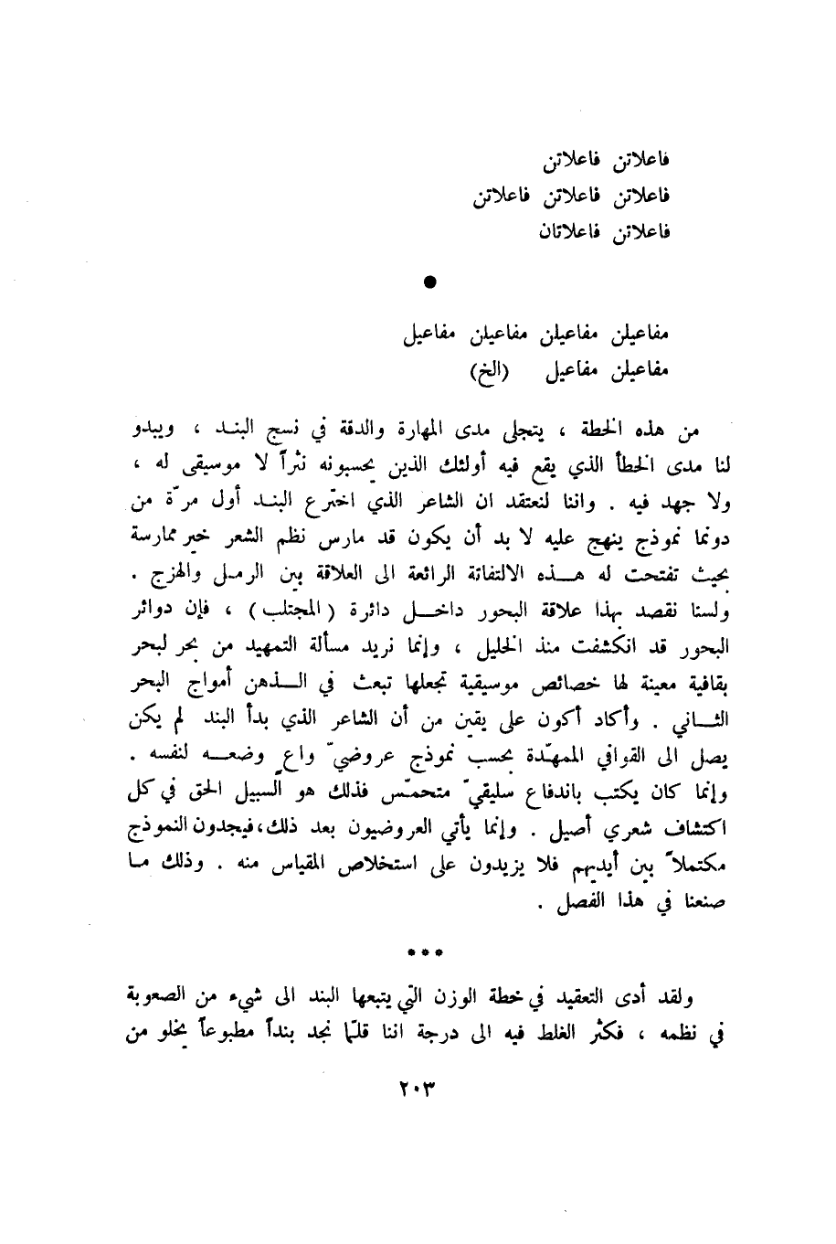 من هذه الخطة، يتجلى مدى المهارة والدقة في نسج البند، ويبدو لنا مدة الخطإ الذي يقع فيه أولئك الذين يحسبونه نثرًا لا موسيقى له، ولا جهد فيه. وإننا لنعتقد أن الشاعر الذي اخترع البند أول مرة من دونما نموذج ينهج عليه لا بد أن يكون قد مارس نظم الشعر خير ممارسة بحيث تفتحت له هذه الالتفاتة الرائعة إلى العلاقة بين الرمل والهزج. ولسنا نقصد بهذا علاقة البحور داخل دائرة "المجتلب"، فإن دوائر البحور قد انكشفت منذ الخليل، وإنما نريد مسألة التمهيد من بحر لبحر بقافية معينة لها خصائص موسيقية تجعلها تبعث في الذهن أمواج البحر الثاني. وأكاد أكون على يقين من أن الشاعر الذي بدأ البند لم يكن يصل إلى القوافي الممهدة بحسب نموذج عروضي واعٍ وضعه لنفسه. وإنما كان يكتب باندفاع سليقي متحمس فذلك هو السبيل الحق في كل اكتشاف شعري أصيل. وإنما يأتي العروضيون بعد ذلك، فيجدون النموذج مكتملًا بين أيديهم فلا يزيدون على استخلاص المقياس منه. وذلك ما صنعنا في هذا الفصل.