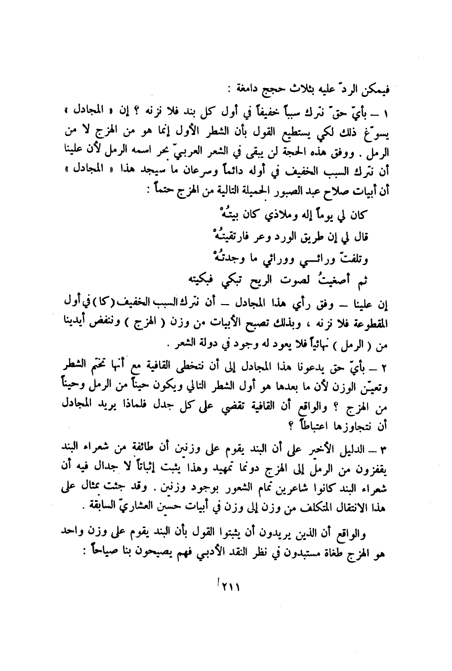 1- بأي حق نترك سببًا خفيفًا في أول كل بند فلا نزنه؟ إن "المجادل" يسوغ ذلك لكي يستطيع القول بأن الشطر الأول إنما هو من الهزج لا من الرمل. ووفق هذه الحجة لن يبقى في الشعر العربي بحر اسمه الرمل لأن علينا أن نترك السبب الخفيف في أوله دائمًا وسرعان ما سيجد هذا "المجادل" أن أبيات صلاح عبد الصبور الجميلة التالية من الهزج حتمًا: