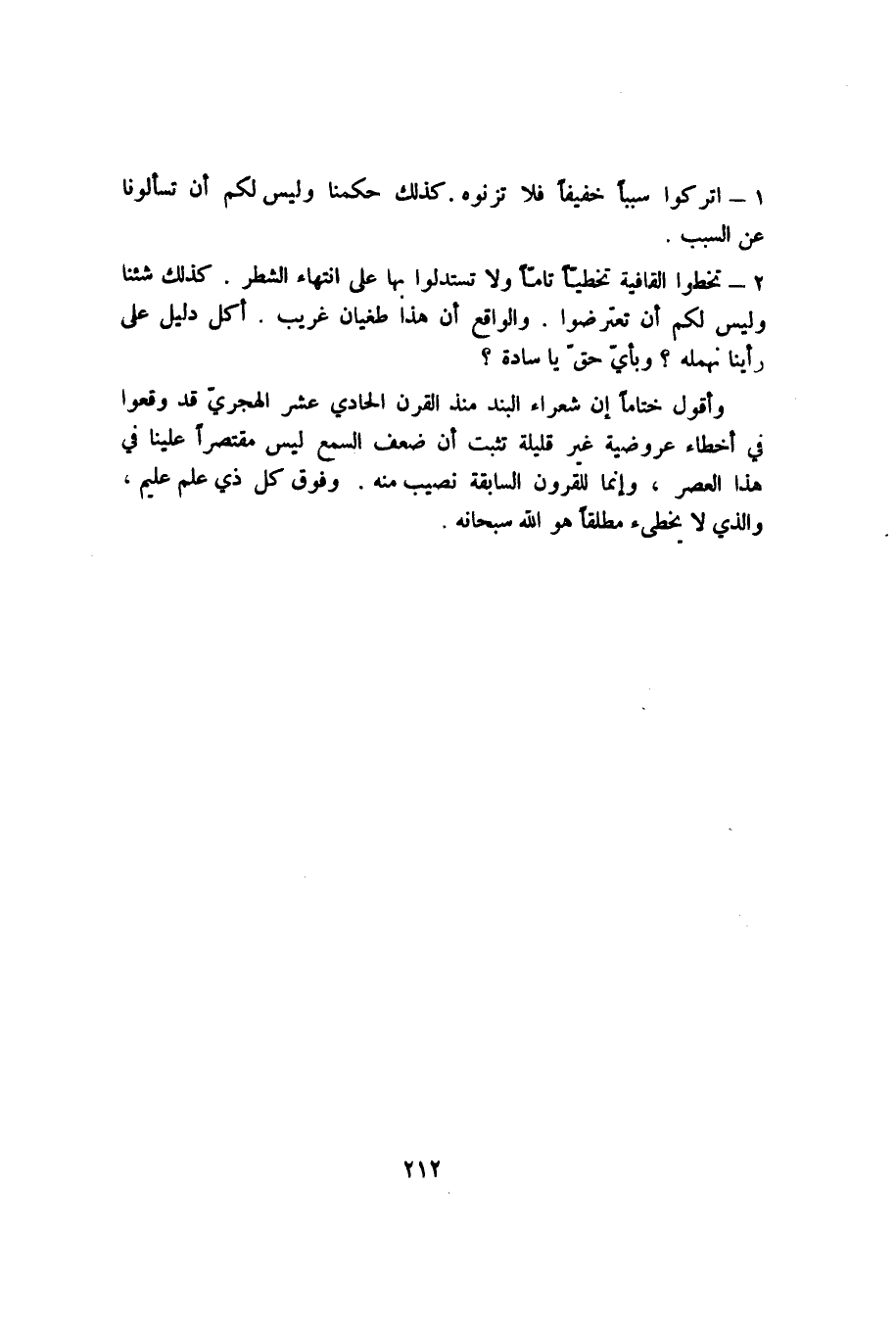 وأقول ختامًا إن شعراء البند منذ القرن الحادي عشر الهجري قد وقعوا في أخطاء عروضية غير قليلة تثبت أن ضعف السمع ليس مقتصرًا علينا في هذا العصر، وإنما للقرون السابقة نصيب منه. وفوق كل ذي علم عليم، والذي لا يخطئ مطلقًا هو الله سبحانه.