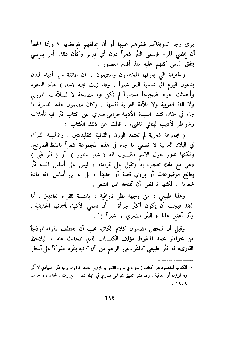 والحقيقة التي يعرفها المختصون والمتتبعون، أن طائفة من أدباء لبنان يدعون اليوم إلى تسمية النثر شعرًا. وقد تبنت مجلة "شعر" هذه الدعوة وأحدثت حولها ضجيجًا مستمرًّا لم تكن فيه مصلحة لا للأدب العربي ولا للغة العربية ولا للأمة العربية نفسها. وكان مضمون هذه الدعوة ما جاء في مقال كتبته السيدة الأديبة خزامى صبري عن كتاب نثر فيه تأملات وخواطر لأديب لبناني ناشئ. قالت عن ذلك الكتاب: