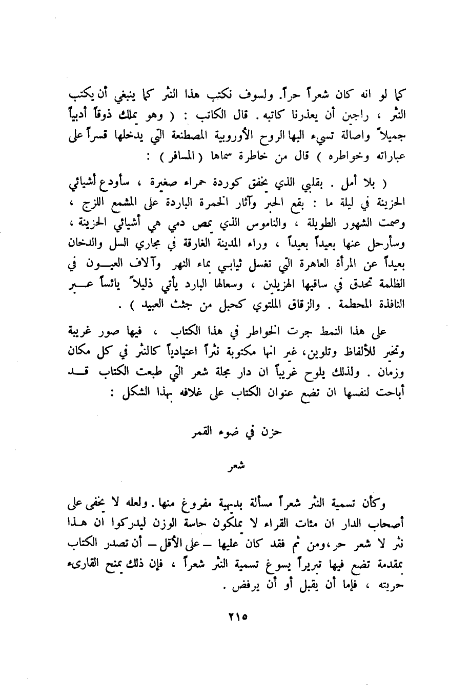 كما لو أنه كان شعرًا حرًّا. ولسوف نكتب هذا النثر كما ينبغي أن يكتب النثر، راجين أن يعذرنا كاتبه. قال الكاتب: "وهو يملك ذوقًا أدبيًّا جميلًا وأصالة تسيء إليها الروح الأوروبية المصطنعة التي يدخلها قسرًا على عباراته وخواطره" قال من خاطره سماها "المسافر":