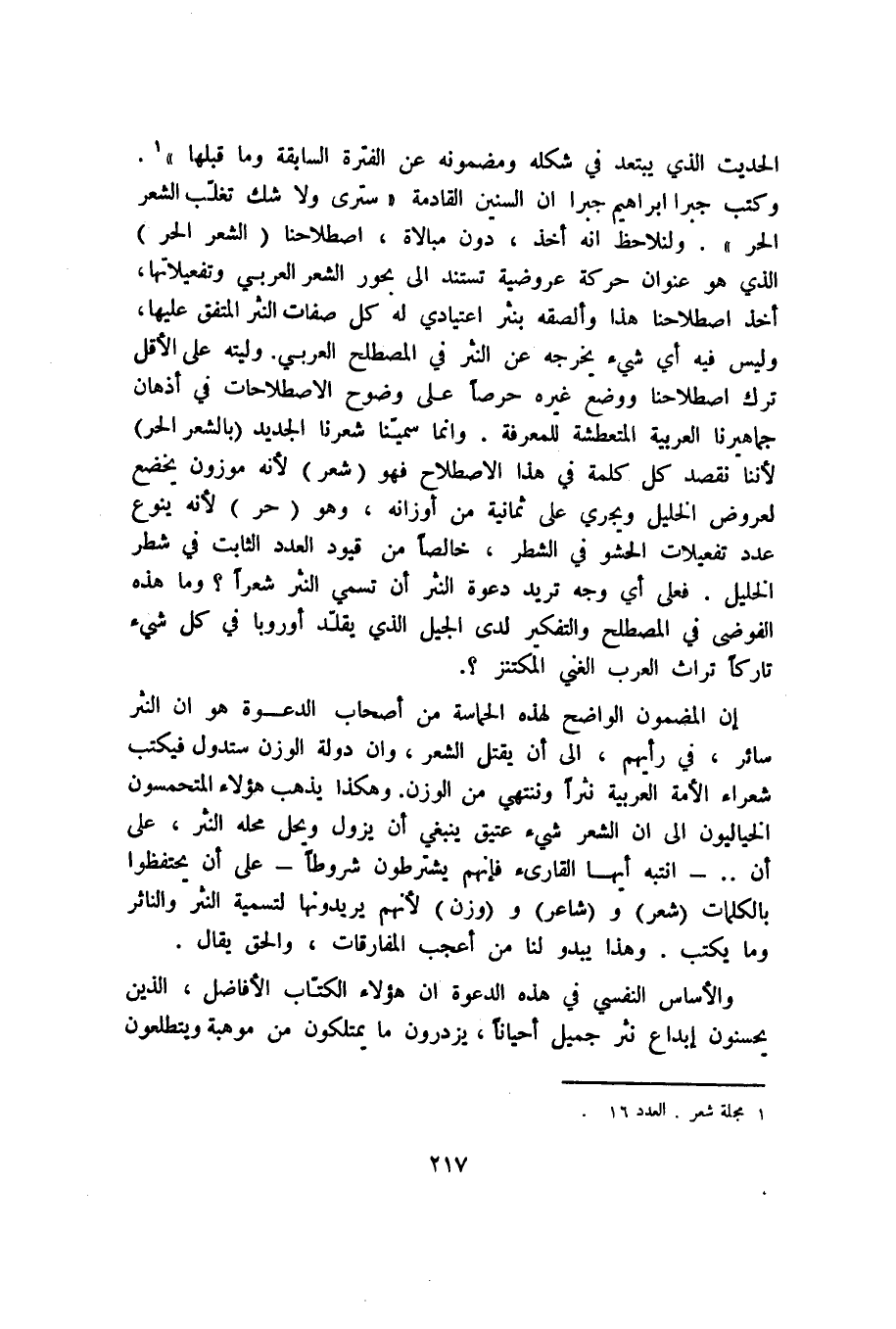 الحديث الذي يبتعد في شكله ومضمونه عن الفترة السابقة وما قبلها"1. وكتب جبرا إبراهيم جبرا أن السنين القادمة "سترى ولا شك تغلب الشعر الحر". ولنلاحظ أنه أخذ، دون مبالاة، اصطلاحنا "الشعر الحر" الذي هو عنوانه حركة عروضية تستند إلى بحور الشعر العربي وتفعيلاتها، أخذ اصطلاحنا هذا وألصقه بنثر اعتيادي له كل صفات النثر المتفق عليها، وليس فيه أي شيء يخرجه عن النثر في المصطلح العربي، وليته على الأقل ترك اصطلاحنا ووضع غيره حرصًا على وضوح الاصطلاحات في أذهان جماهيرنا العربية المتعطشة للمعرفة. وإنما سمينا شعرنا الجديد "بالشعر الحر" لأننا نقصد كل كلمة في هذا الاصطلاح فهو "شعر" لأنه موزون يخضع لعروض الخليل ويجري على ثمانية من أوزانه، وهو "حر" لأنه ينوع عدد تفعيلات الحشو في الشطر، خالصًا من قيود العدد الثابت في شطر الخليل. فعلى أي وجه تريد دعوة النثر أن تسمي النثر شعرًا؟ وما هذه الفوضى في المصطلح والتفكير لدى الجيل الذي يقلد أوروبا في كل شيء تاركًا تراث العرب الغني المكتنز؟