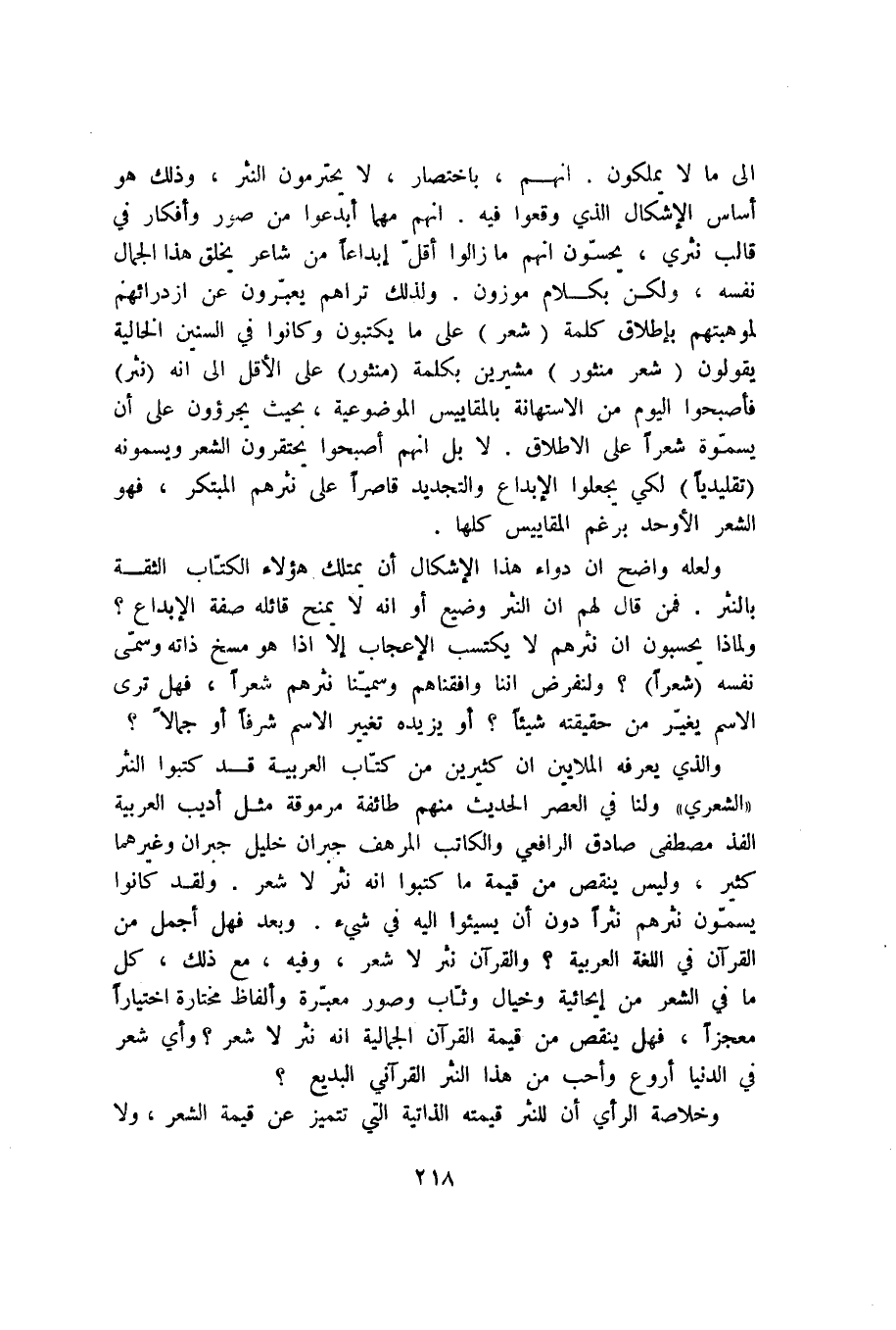 والذي يعرفه الملايين أن كثيرين من كتاب العربية قد كتبوا النثر "الشعري" ولنا في العصر الحديث منهم طائفة مرموقة مثل أديب العربية الفذ مصطفى صادق الرافعي والكاتب المرهف جبران خليل جبران وغيرهما كثير، وليس ينقص من قيمة ما كتبوا أنه نثر لا شعر. ولقد كانوا يسمون نثرهم نثرًا دون أن يسيئوا إليه في شيء. وبعد فهل أجمل من القرآن في اللغة العربية؟ والقرآن نثر لا شعر، وفيه، مع ذلك، كل ما في الشعر من إيحائية وخيال وثاب وصور معبرة وألفاظ مختارة اختيارًا معجزًا، فهل ينقص من قيمة القرآن الجمالية أنه نثر لا شعر؟ وأي شعر في الدنيا أروع وأحب من هذا النثر القرآني البديع؟
