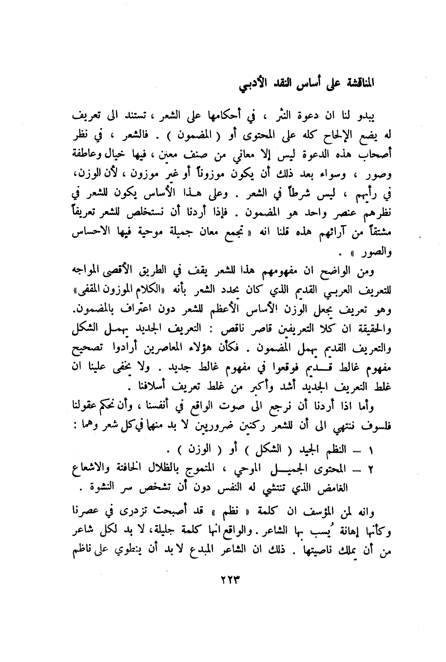 وأما إذا أردنا أن نرجع إلى صوت الواقع في أنفسنا، وأن نحكم عقولنا فلسوف ننتهي إلى أن للشعر ركنين ضروريين لا بد منهما في كل شعر وهما:
