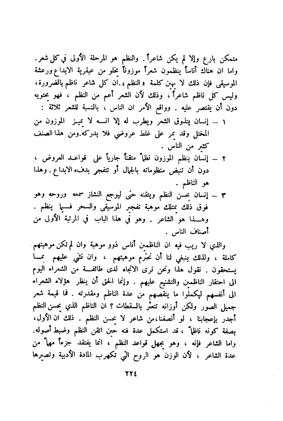 متمكن بارع وإلا لم يكن شاعرًا. والنظم هو المرحلة الأولى في كل شعر. وأما أن هناك أناسًا ينظمون شعرًا موزونًا يخلو من عبقرية الإبداع ورعشة الموسيقى فإن ذلك لا يهين كلمة "النظم". إن كل شاعر ناظم بالضرورة، وليس كل ناظم شاعرًا، وذلك لأن الشعر أعم من النظم، فهو يحتويه دون أن يقتصر عليه. وواقع الأمر أن الناس، بالنسبة للشعر ثلاثة: