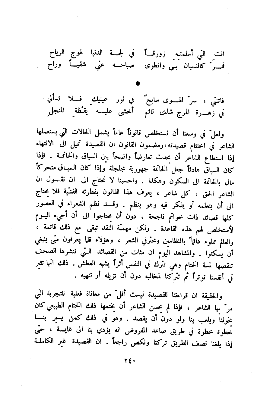 ولعل في وسعنا أن نستخلص قانونًا عامًّا يشمل الحالات التي يستعملها الشاعر في اختتام قصيدته، ومضمون القانون أن القصيدة تميل إلى الانتهاء إذا استطاع الشاعر أن يحدث تعارضًا واضحًا بين السياق والخاتمة. فإذا كان السياق هادئًا جعل الخاتمة جهورية مجلجلة وإذا كان السياق متحركًا مال بالخاتمة إلى السكون وهكذا. واحسبنا لا نحتاج إلى أن نقول إن الشاعر الحق، كل شاعر، يعرف هذا القانون بفطرته الفنية فلا يحتاج إلى أن يتعلمه أو يفكر فيه وهو ينظم. وقد نظم الشعراء في العصور كلها قصائد ذات خواتم ناجحة، دون أن يحتاجوا إلى أن أجيء اليوم لأستخلص لهم هذه القاعدة. ولكن مهمة النقد تبقى مع ذلك قائمة، والعالم مملوء دائمًا بالنظامين ومحترفي الشعر، وهؤلاء قلما يعرفون متى ينبغي أن يسكتوا. والمشاهد اليوم أن مئات من القصائد التي تنشرها الصحف تنقصها لمسة الختام وهي تترك في النفس أثرًا يشبه العطش. ذلك أنها تثير في أنفسنا توترًا ثم تتركنا لمخالبه دون أن تزيله أو تنهيه.