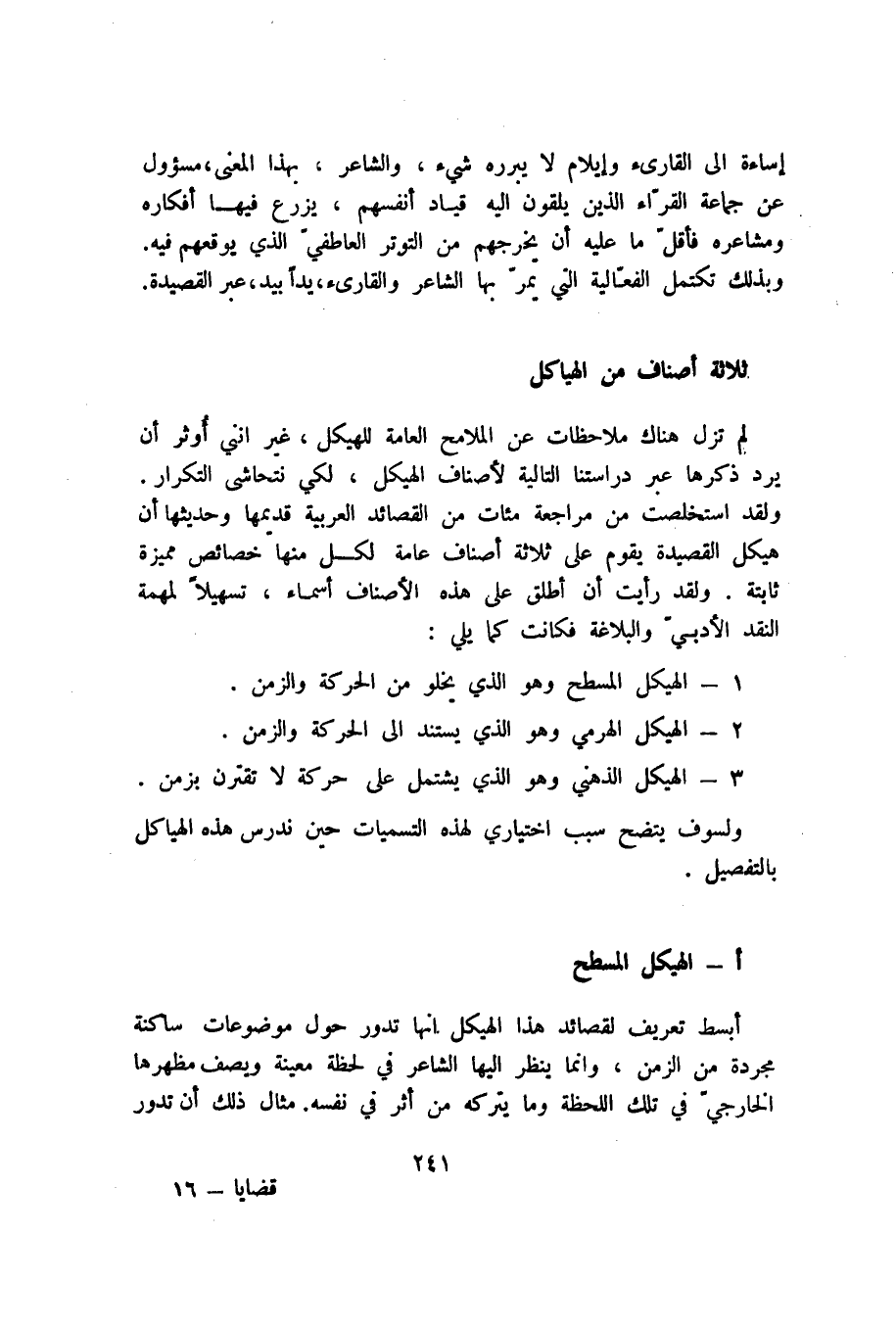 لم تزل هناك ملاحظات عن الملامح العامة للهيكل، غير أنني أُوثر أن يرد ذكرها عبر دراستنا التالية لأصناف الهيكل، لكي نتحاشى التكرار، ولقد استخلصت من مراجعة مئات من القصائد العربية قديمها وحديثها أن هيكل القصيدة يقوم على ثلاثة أصناف عامة لكل منها خصائص مميزة ثابتة. ولقد رأيت أن أطلق على هذه الأصناف أسماء، تسهيلًا لمهمة النقد الأدبي والبلاغة فكانت كما يلي:
