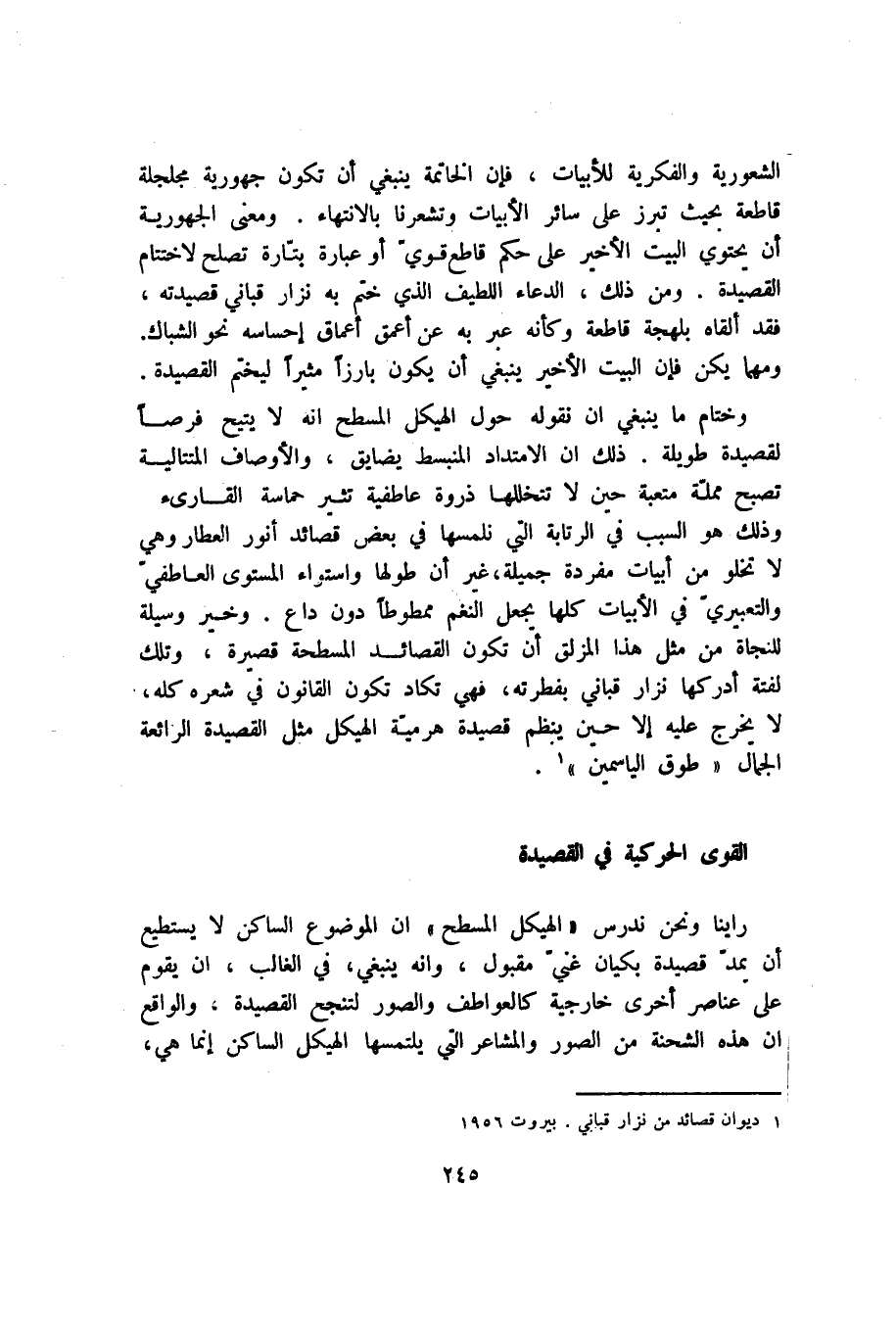 وختام ما ينبغي أن نقوله حول الهيكل المسطح أنه لا يتيح فرصًا لقصيدة طويلة. ذلك أن الامتداد المنبسط يضايق، والأوصاف المتتالية تصبح مملة متعبة حين لا تتخللها ذروة عاطفية تثير حماسة القارئ وذلك هو السبب في الرتابة التي نلمسها في بعض قصائد أنور العطار وهي لا تخلو من أبيات مفردة جميلة، غير أن طولها واستواء المستوى العاطفي والتعبيري في الأبيات كلها يجعل النغم ممطوطًا دون داعٍ. وخير وسيلة للنجاة من مثل هذا المزلق أن تكون القصائد المسطحة قصيرة، وتلك لفتة أدركها نزار قباني بفطرته، فهي تكاد تكون القانون في شعره كله، لا يخرج عليه إلا حين ينظم قصيدة هرمية الهيكل مثل القصيدة الرائعة الجمال "طوق الياسمين"1.