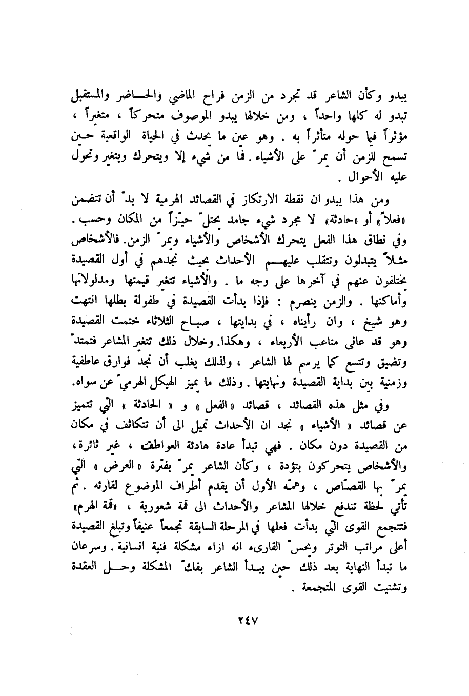 وفي مثل هذه القصائد، قصائد "الفعل" و"الحادثة" التي تتميز عن قصائد "الأشياء" نجد أن الأحداث تميل إلى أن تتكاثف في مكان من القصيدة دون مكان. فهي تبدأ عادة هادئة العواطف، غير ثائرة، والأشخاص يتحركون بتؤدة، وكأن الشاعر يمر بفترة "العرض" التي يمر بها القصاص، وهمه الأول أن يقدم أطراف الموضوع لقارئه. ثم تأتي لحظة تندفع خلالها المشاعر والأحداث إلى قمة شعورية، "قمة الهرم" فتتجمع القوى التي بدأت فعلها في المرحلة السابقة تجمعًا عنيفًا وتبلغ القصيدة أعلى مراتب التوتر ويحس القارئ أنه إزاء مشكلة فنية إنسانية. وسرعان ما تبدأ النهاية بعد لك حين يبدأ الشاعر بفك المشكلة وحل العقدة وتشتيت القوى المتجمعة.