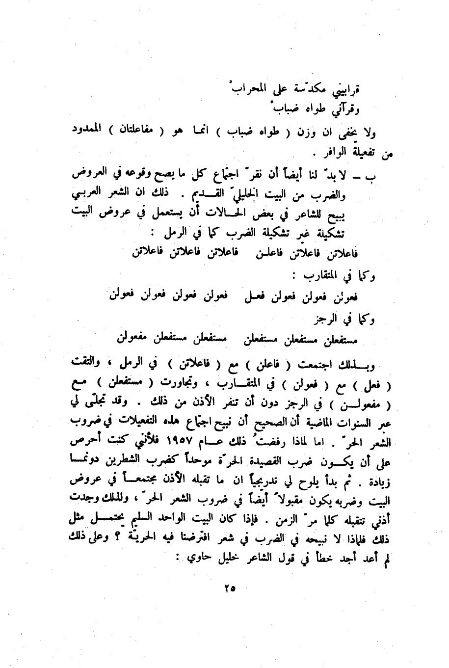 وبذلك اجتمعت "فاعلن" مع "فاعلاتن" في الرمل، والتقت "فعل" مع "فعولن" في المتقارب، وتجاورت "مستفعلن" مع "مفعولن" في الرجز دون أن تنفر الأذن من ذلك. وقد تجلى لي عبر السنوات الماضية أن الصحيح أن نبيح اجتماع هذه التفعيلات في ضروب الشعر الحر. أما لماذا رفضت ذلك عام 1957 فلأنني كنت أحرص على أن يكون ضرب القصيدة الحرة موحدًا كضرب الشطرين دونما زيادة. ثم بدأ يلوح لي تدريجيًّا أن ما تقبله الأذن مجتمعًا في عروض البيت وضربه يكون مقبولًا أيضًا في ضروب الشعر الحر، ولذلك وجدت أذني تتقبله كلما مر الزمن. فإذا كان البيت الواحد السليم يحتمل مثل ذلك فلماذا لا نبيحه في الضرب في شعر افترضنا فيه الحرية؟ وعلى ذلك لم أعد أجد خطأ في قول الشاعر خليل حاوي: