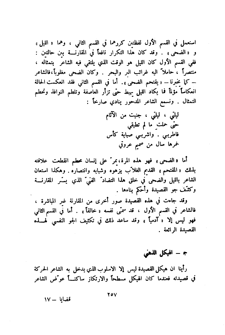 أما "الضحى" فهو هذه المرة، يمر على إنسان محطم انقطعت علاقته بذلك "المقتحم" القديم الغلاب بزهوه وشبابه وانتصاره. وهكذا استعان الشاعر بالليل والضحى في خلق هذا التضاد الفني الذي يسر المقارنة وكثف جو القصيدة وأحكم بناءها.