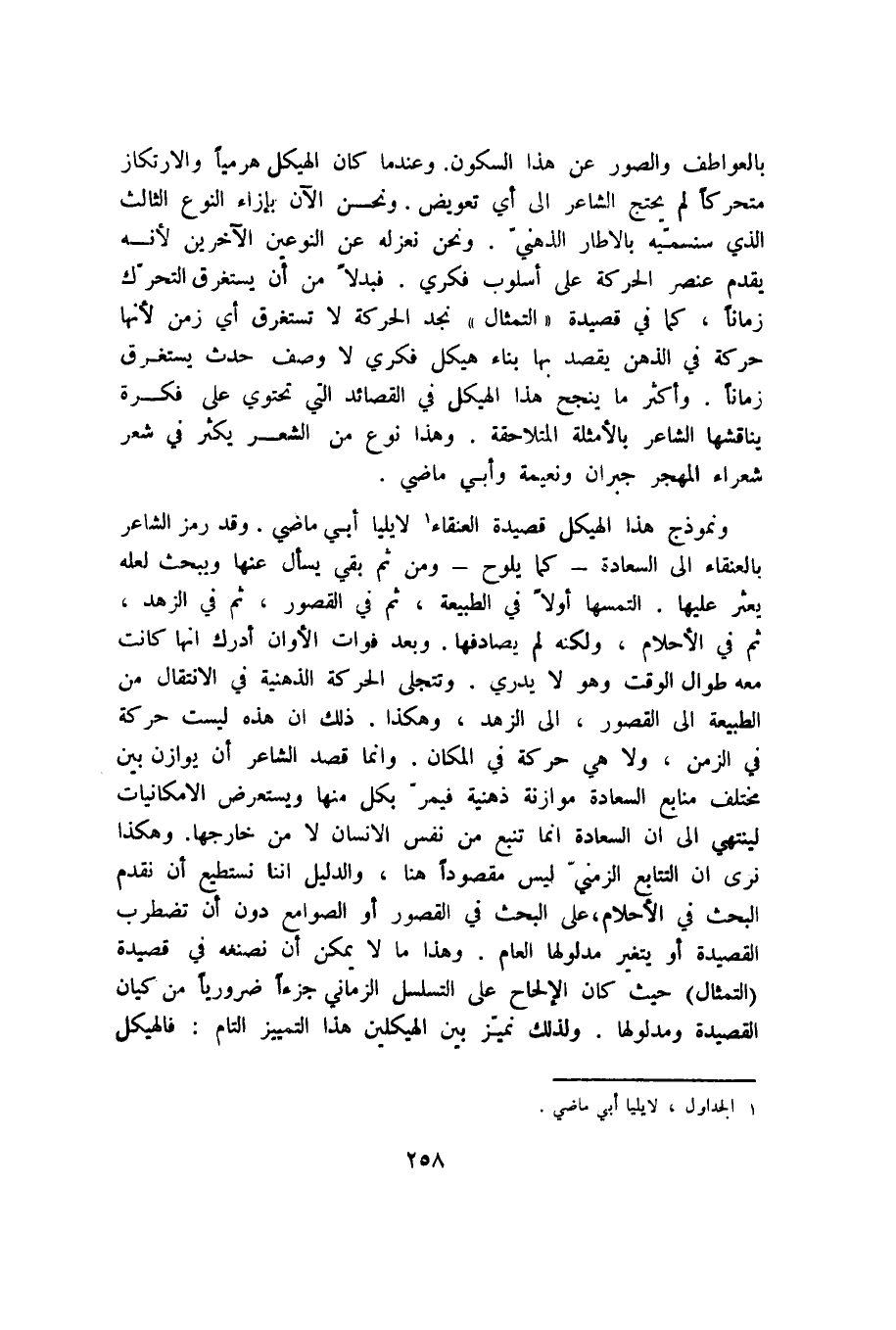ونموذج هذا الهيكل قصيدة العنقاء1 لإيليا أبي ماضي. وقد رمز الشاعر بالعنقاء إلى السعادة -كما يلوح- ومن ثم بقي يسأل عنها ويبحث لعله يعثر عليها. التمسها أولًا في الطبيعة، ثم في القصور، ثم في الزهد، ثم في الأحلام، ولكنه لم يصادفها. وبعد فوات الأوان أدرك أنها كانت معه طوال الوقت وهو لا يدري. وتتجلى الحركة الذهنية في الانتقال من الطبيعة إلى القصور، إلى الزهد، وهكذا. ذلك أن هذه ليست حركة في الزمن، ولا هي حركة في المكان. وإنما قصد الشاعر أن يوازن بين مختلف منابع السعادة موازنة ذهنية فيمر بكل منها ويستعرض الإمكانيات لينتهي إلى أن السعادة إنما تنبع من نفس الإنسان لا من خارجها. وهكذا نرى أن التتابع الزمني ليس مقصودًا هنا، والدليل أننا نستطيع أن نقدم البحث في الأحلام، على البحث في القصور أو الصوامع دون أن تضطرب القصيدة أو يتغير مدلولها العام. وهذا ما لا يمكن أن نصنعه في قصيدة "التمثال" حيث كان الإلحاح على التسلسل الزماني جزءًا ضروريًّا من كيان القصيدة ومدلولها. ولذلك نميز بين الهيكلين هذا التميز التام: فالهيكل