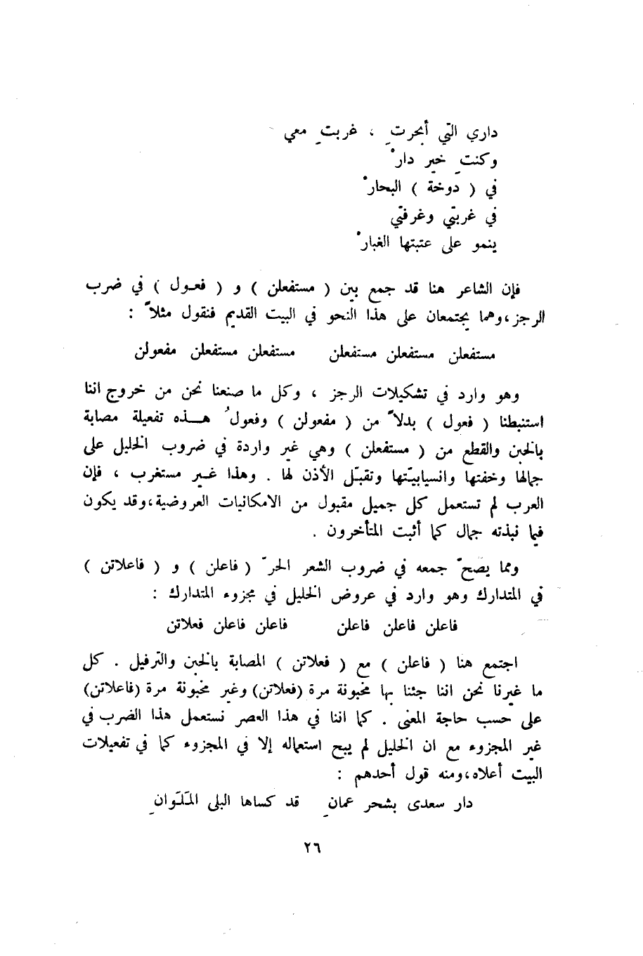 وهو وارد في تشكيلات الرجز، وكل ما صنعنا نحن من خروج أننا استنبطنا "فعول" بدلًا من "مفعولن" وفعولُ هذه تفعيلة مصابة بالخبن والقطع من "مستفعلن" وهي غير واردة في ضروب الخليل على جمالها وخفتها وانسيابيتها وتقبل الأذن لها. وهذا غير مستغرب، فإن العرب لم تستعمل كل جميل مقبول من الإمكانيات العروضية، وقد يكون فيما نبذته جمال كما أثبت المتأخرون.