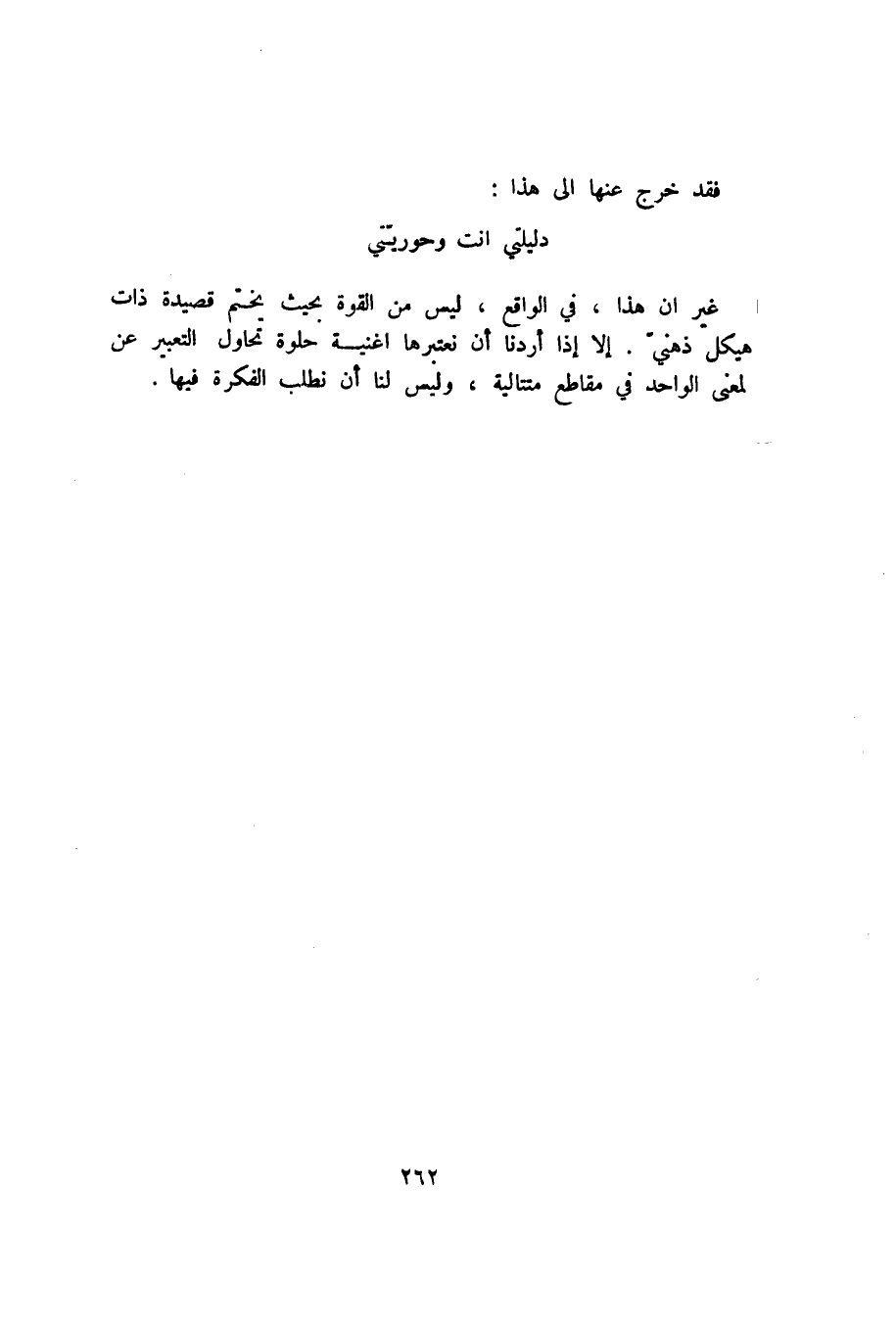 غير أن هذا، في الواقع، ليس من القوة بحيث يختم قصيدة ذات هيكل ذهني. إلا إذا أردنا أن نعتبرها أغنية حلوة تحاول التعبير عن المعنى الواحد في مقاطع متتالية، وليس لنا أن نطلب الفكرة فيها.