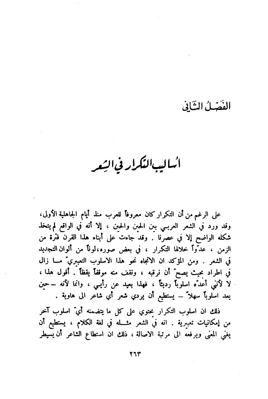على الرغم من أن التكرار كان معروفًا للعرب منذ أيام الجاهلية الأولى، وقد ورد في الشعر العربي بين الحين والحين، إلا أنه في الواقع لم يتخذ شكله الواضح إلا في عصرنا. وقد جاءت على أبناء هذا القرن فترة من الزمن عدوا خلالها التكرار، في بعض صوره، لونًا من ألوان التجديد في الشعر. ومن المؤكد أن الاتجاه نحو هذا الأسلوب التعبيري ما زال في اطراد بحيث يصح أن نرقبه، ونقف منه موقفًا يقظًا. أقول هذا لا لأنني أعده أسلوبًا رديئًا، فهذا بعيد عن رأيي، وإنما لأنه -حين يعد أسلوبًا سهلًا- يستطيع أن يردي شعر أي شاعر إلى هاوية.