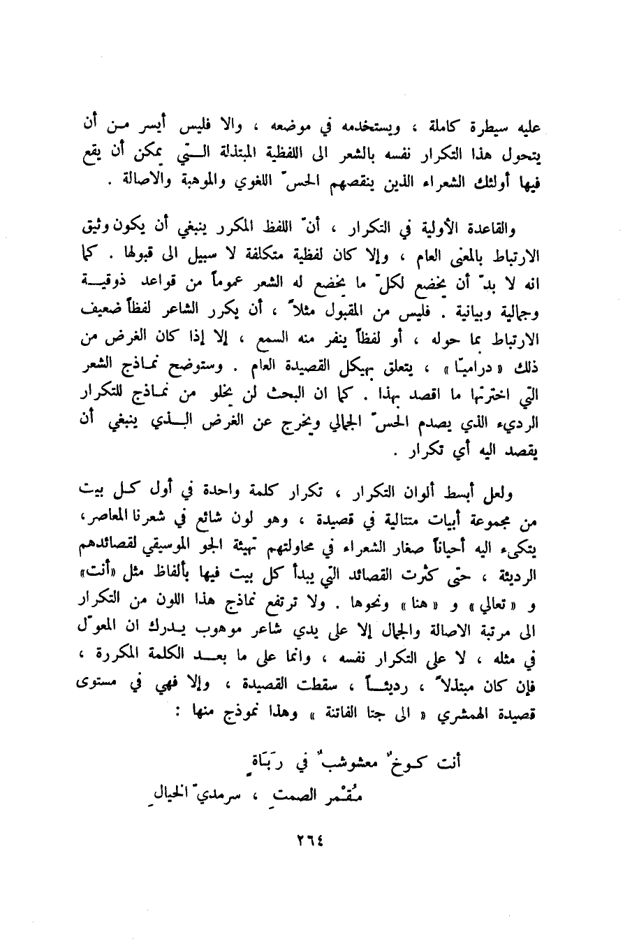 عليه سيطرة كاملة، ويستخدمه في موضعه، وإلا فليس أيسر من أن يتحول التكرار نفسه بالشعر إلى اللفظية المبتذلة التي يمكن أن يقع فيها أولئك الشعراء الذين ينقصهم الحس اللغوي والموهبة والأصالة.