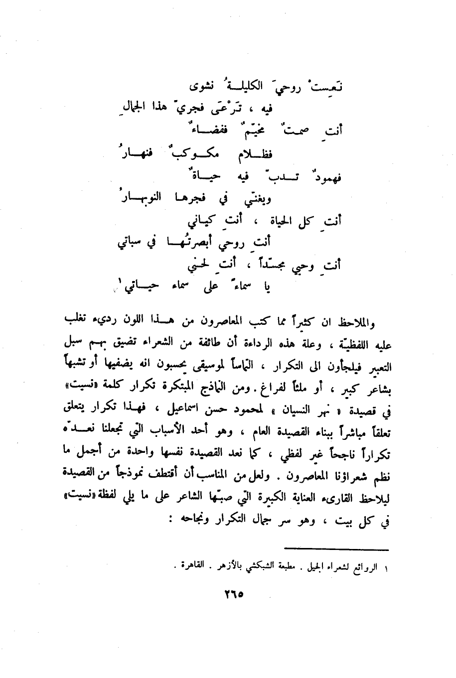 والملاحظ أن كثيرًا مما كتب المعاصرون من هذا اللون رديء تغلب عليه اللفظية، وعلة هذه الرداءة أن طائفة من الشعراء تضيق بهم سبل التعبير فيلجئون إلى التكرار، التماسًا لموسيقى يحسبون أنه يضفيها أو تشبهًا بشاعر كبير، أو ملئًا لفراغ. ومن النماذج المبتكرة تكرار كلمة "نسيت" في قصيدة "نهر النسيان" لمحمود حسن إسماعيل، فهذا تكرار يتعلق تعلقًا مباشرًا ببناء القصيدة العام، وهو أحد الأسباب التي تجعلنا نعده تكرارًا ناجحًا غير لفظي، كما نعد القصيدة نفسها واحدة من أجمل ما نظم شعراؤنا المعاصرون. ولعل من المناسب أن أقتطف نموذجًا من القصيدة ليلاحظ القارئ العناية الكبيرة التي صبَّها الشاعر على ما يلي لفظة "نسيت" في كل بيت، وهو سر جمال التكرار ونجاحه: