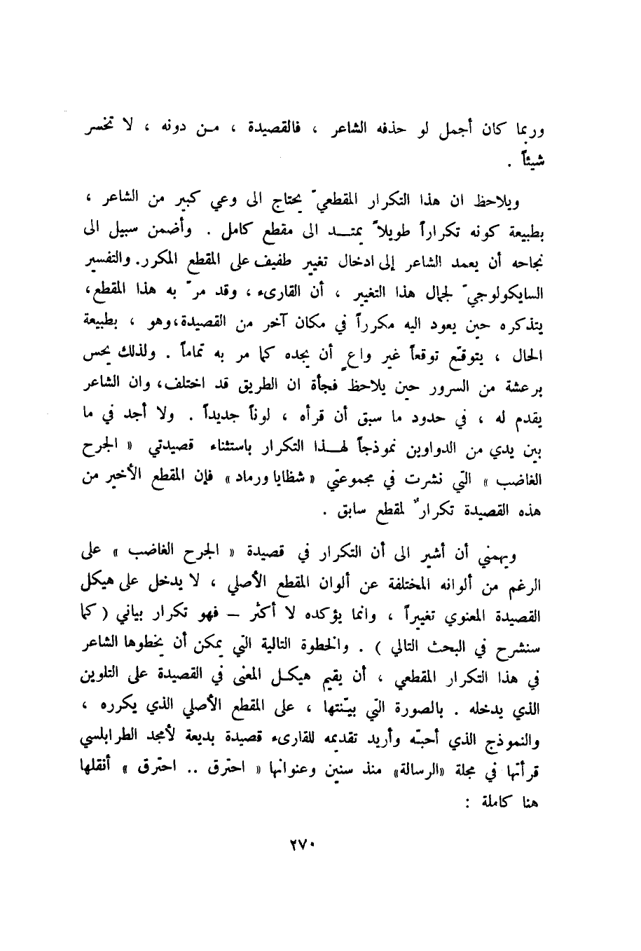 ويلاحظ أن التكرار المقطعي يحتاج إلى وعي كبير من الشاعر، بطبيعة كونه تكرارًا طويلًا يمتد إلى مقطع كامل. وأضمن سبيل إلى نجاحه أن يعمد الشاعر إدخال تغيير طفيف على المقطع المكرر، والتفسير السايكولوجي لجمال هذا التغيير، أن القارئ وقد مر به هذا المقطع، يتذكره حين يعود إليه مكررًا في مكان آخر من القصيدة، وهو بطبيعة الحال، يتوقع توقعًا غير واعٍ أن يجده كما مر به تمامًا. ولذلك يحس برعشة من السرور حين يلاحظ فجأة أن الطريق قد اختلف، وأن الشاعر يقدم له، في حدود ما سبق أن قرأه، لونًا جديدًا. ولا أجد في ما بين يدي من الدواوين نموذجًا لهذا التكرار باستثناء قصيدتي "الجرح الغاضب" التي نشرت في مجموعتي "شظايا ورماد" فإن المقطع الأخير من هذه القصيدة تكرار لمقطع سابق.