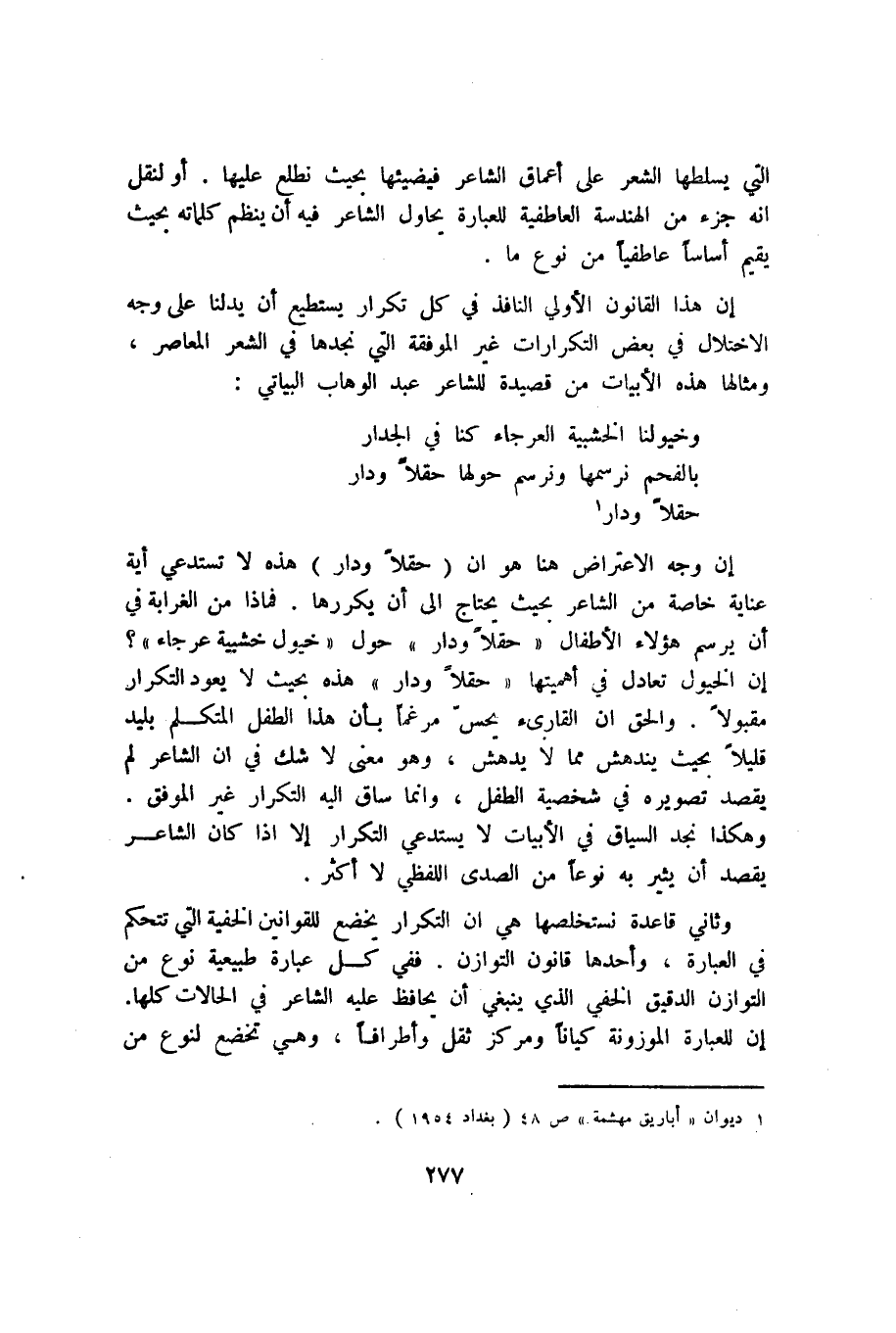 إن وجه الاعتراض هنا هو أن "حقلًا ودار" هذه لا تستدعي أية عناية خاصة من الشاعر بحيث يحتاج إلى أن يكررها. فماذا من الغرابة في أن يرسم هؤلاء الأطفال "حقلًا ودار" حول "خيول خشبية عرجاء"؟ إن الخيول تعادل في أهميتها "حقلًا ودار" هذه بحيث لا يعود التكرار مقبولًا. والحق أن القارئ يحس مرغمًا بأن هذا الطفل المتكلم بليد قليلًا بحيث يندهش مما لا يدهش، وهو معنى لا شك في أن الشاعر لم يقصد تصويره في شخصية الطفل، وإنما ساق إليه التكرار غير الموفق. وهكذا نجد السياق في الأبيات لا يستدعي التكرار إلا إذا كان الشاعر يقصد أن يثير به نوعًا من الصدى اللفظي لا أكثر.