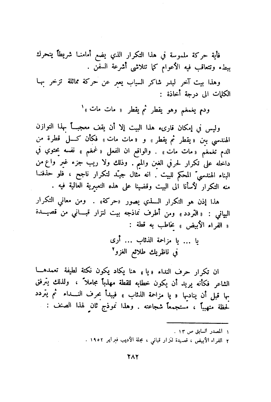 وليس في إمكان قارئ هذا البيت إلا أن يقف معجبًا بهذا التوازن الهندسي بين "يقطر ثم يقطر" و"مات مات" فكأن كل قطرة من الدم تغمغم "مات مات". والواقع أن الفعل "غمغم" نفسه يحتوي في داخله على تكرار لحرفي الغين والميم. وذلك لا ريب جزء غير واعٍ من البناء الهندسي المحكم للبيت. إنه مثال جيد لتكرار ناجح، فلو حذفنا منه التكرار لأسأنا إلى البيت وقضينا على هذه التعبيرية العالية فيه.