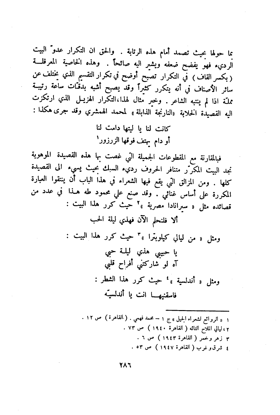 فبالمقارنة مع المقطوعات الجميلة التي غصت بها هذه القصيدة الموهوبة نجد البيت المكرر متنافر الحروف رديء السبك بحيث يسيء إلى القصيدة كلها. ومن المزالق التي يقع فيها الشعراء في هذا الباب أن ينتقوا العبارة المكررة على أساس غنائي. وقد صنع علي محمود طه هذا في عدد من قصائده مثل "سيرانادا مصرية"2 حيث كرر هذا البيت: