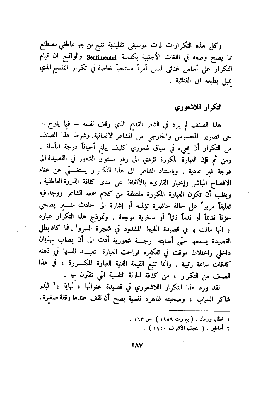 لقد ورد هذا التكرار اللاشعوري في قصيدة عنوانها "نهاية"2 لبدر شاكر السياب، وصحبته ظاهرة يصح أن نقف عندها وقفة صغيرة،