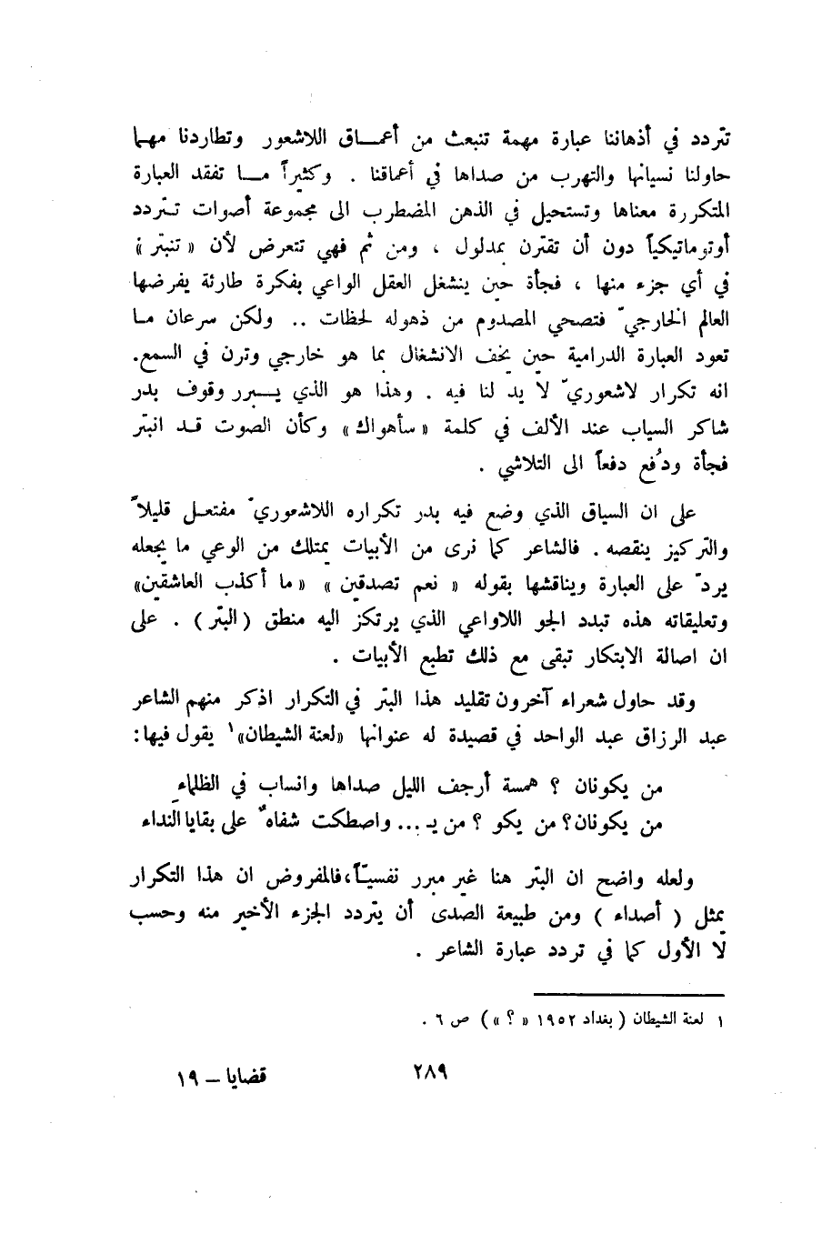 تتردد في أذهاننا عبارة مهمة تنبعث من أعماق اللاشعور وتطاردنا مهما حاولنا نسيانها والتهرب من صداها في أعماقنا. وكثيرًا مما تفقد العبارة المتكررة معناها وتستحيل في الذهن المضطرب إلى مجموعة أصوات تتردد أوتوماتيكيًّا دون أن تقترن بمدلول، ومن ثم فهي تتعرض لأن "تنبتر" في أي جزء منها، فجأة حين ينشغل العقل الواعي بفكرة طارئة يفرضها العالم الخارجي، فتصحي المصدوم من ذهوله لحظات.. ولكن سرعان ما تعود العبارة الدرامية حين يخف الانشغال بما هو خارجي وترن في السمع. أنه تكرار لاشعوري لا يد لنا فيه. وهذا هو الذي يبرر وقوف بدر شاكر السياب عند الألف في كلمة "سأهواك" وكأن الصوت في انبتر فجأة ودُفع دفعًا إلى التلاشي.