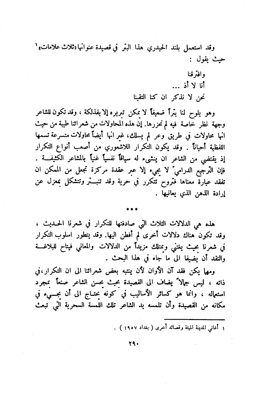 ومهما يكن فقد آن الأوان لأن ينتبه بعض شعرائنا إلى أن التكرار، في ذاته، ليس جمالًا يضاف إلى القصيدة بحيث يحسن الشاعر صنعًا بمجرد استعماله، وإنما هو كسائر الأساليب في كونه يحتاج إلى أن يجيء في مكانه من القصيدة وأن تلمسه يد الشاعر تلك اللمسة السحرية التي تبعث